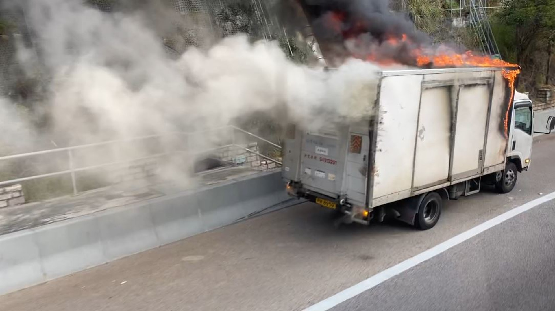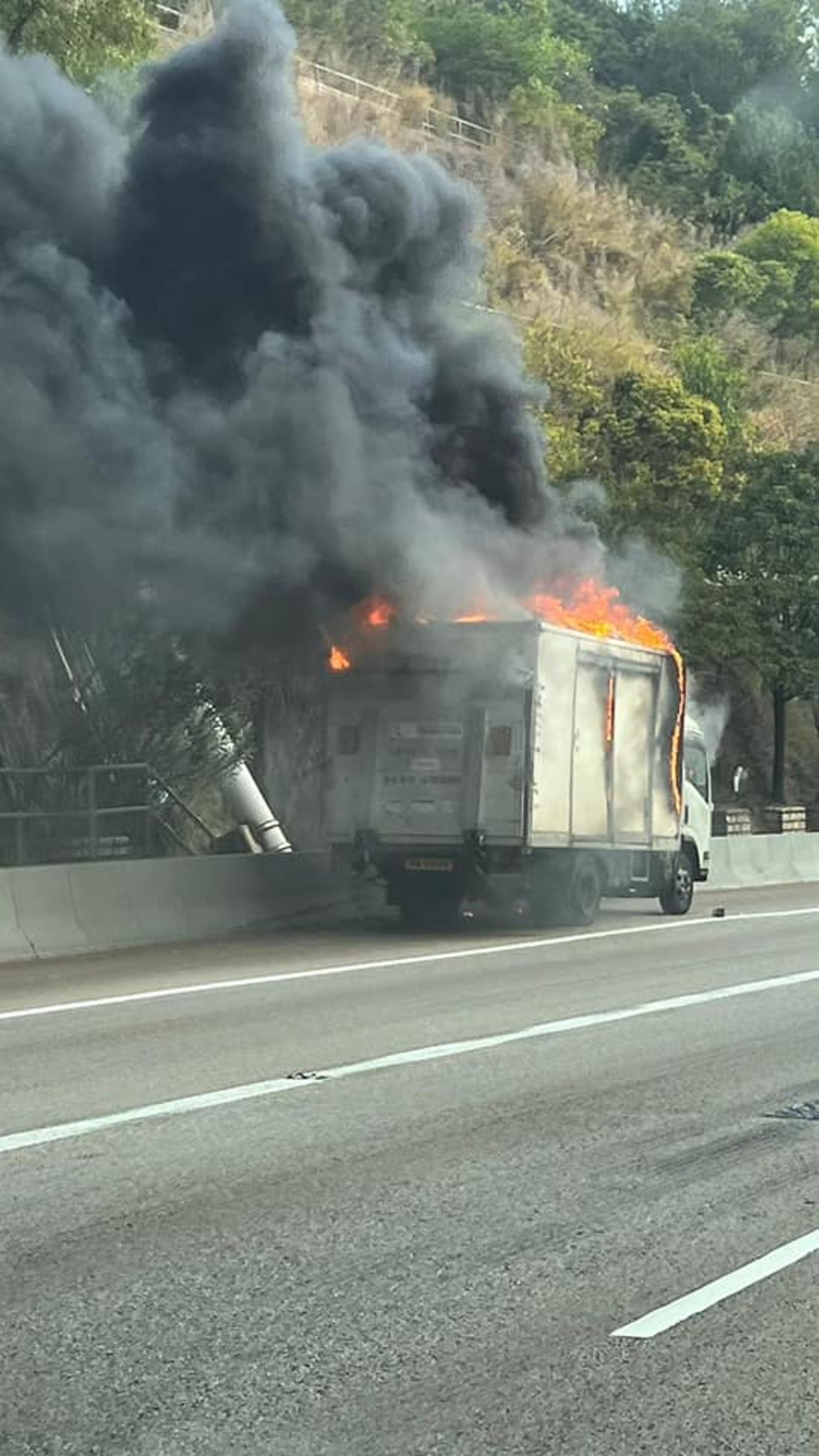 大公文匯全媒體報道:今日(13日)早近9時,屯門公路往九龍方向近青龍頭發生交通事故。一輛貨車行駛期間突然起火,司機將貨車停在路邊後離開車廂。貨車貨櫃火光熊熊,煙霧瀰漫,貨櫃燒毀熏黑。