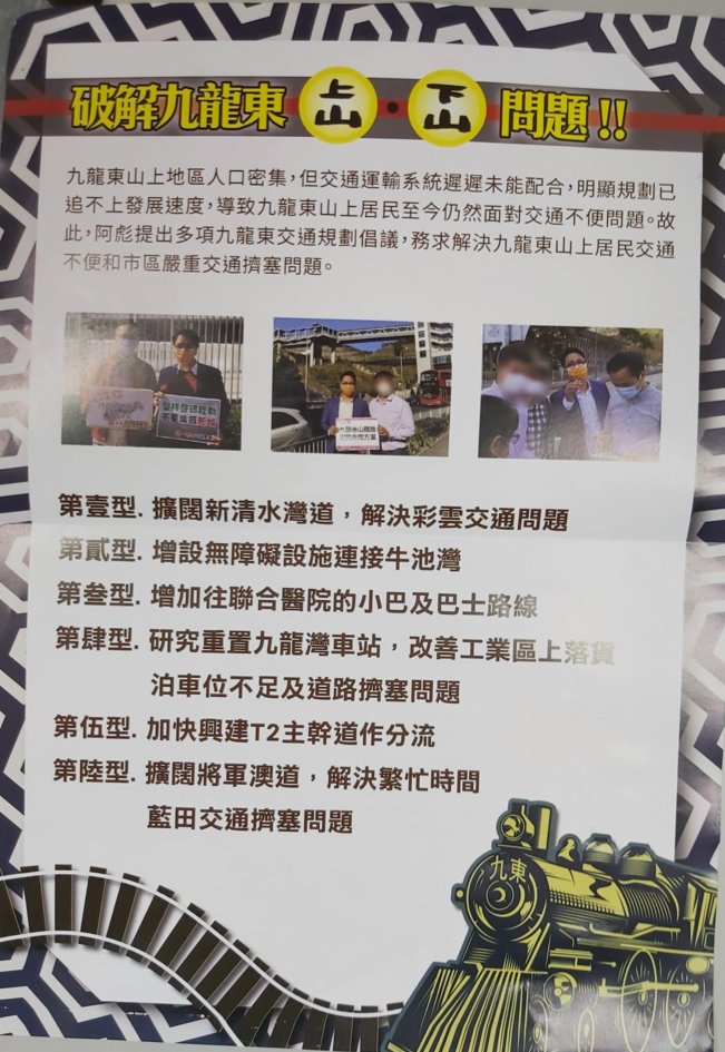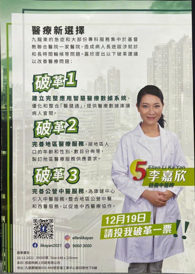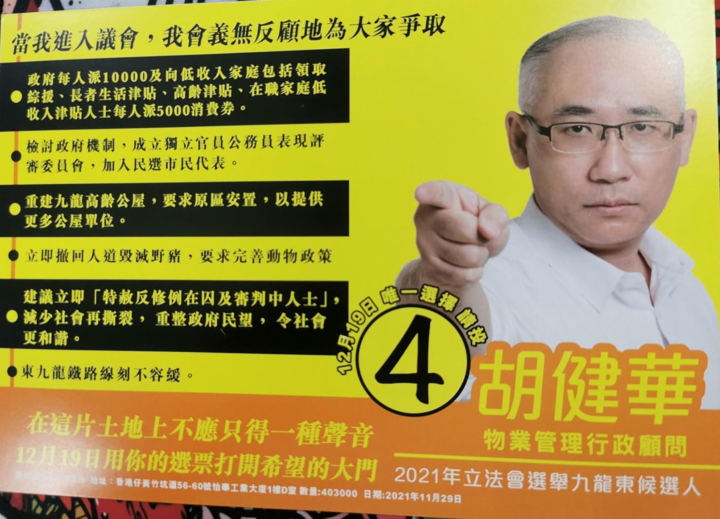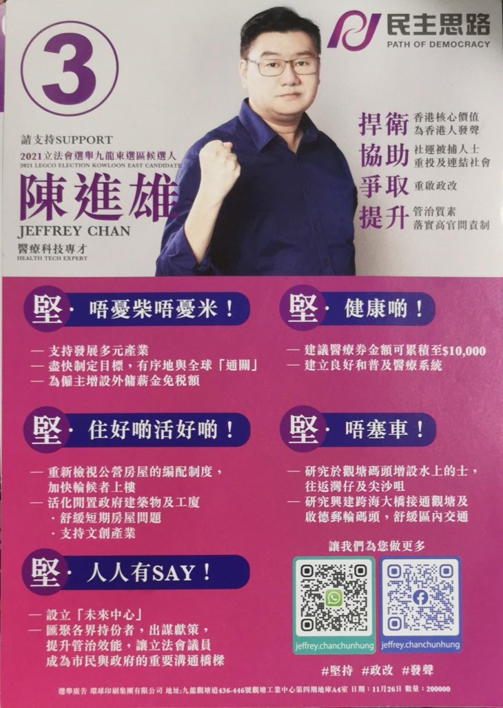 九龍東地區直選共有5名候選人,分別是:1號鄧家彪、2號顏汶羽、3號陳進雄、4號胡健華、5號李嘉欣。