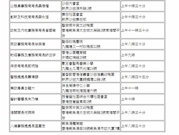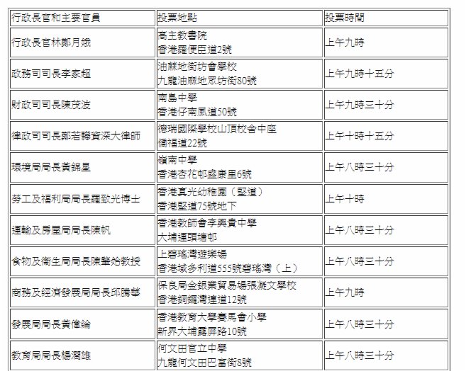 更多政府主要官員投票地點及時間,可參閱下表: