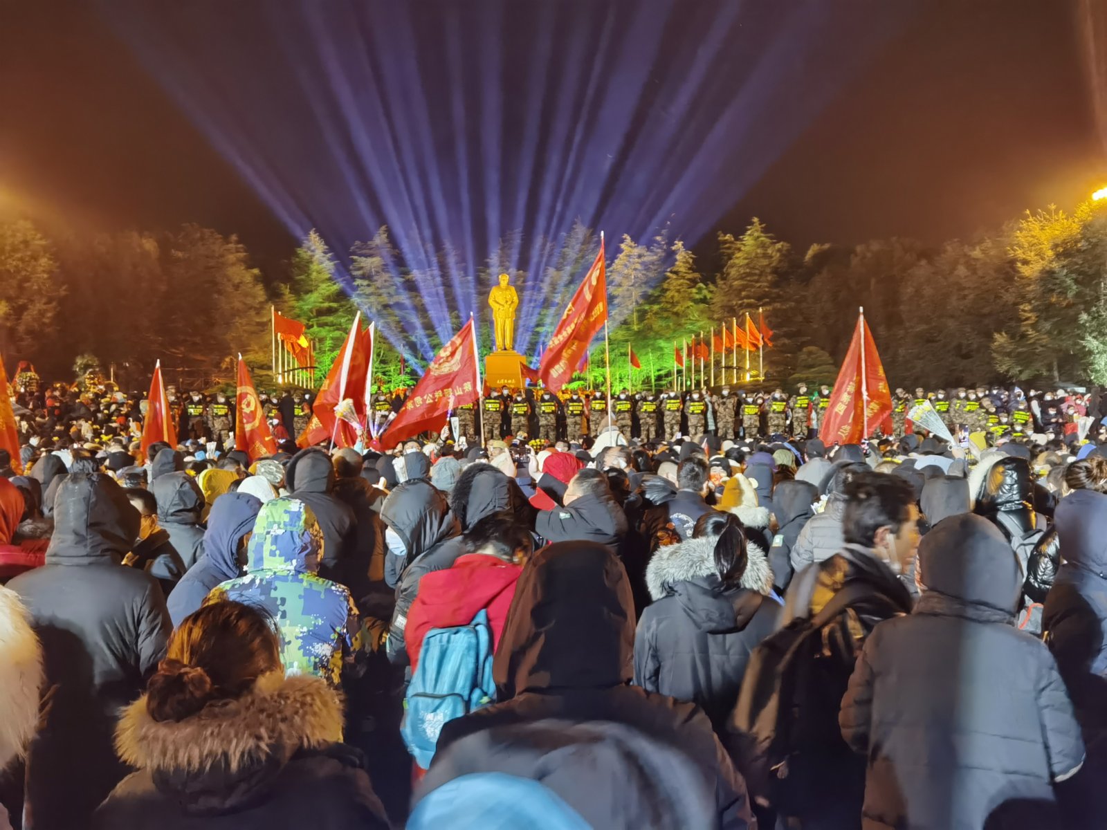 吃完福壽麵,上午8點,來自全國各地的群眾,以向毛澤東銅像獻花的形式表達對一代偉人的緬懷與敬仰之情。現場所有人緩緩向銅像三鞠躬後,「東方紅,太陽升,中國出了個毛澤東……」熟悉的旋律響起,現場萬人同唱頌歌——《東方紅》。