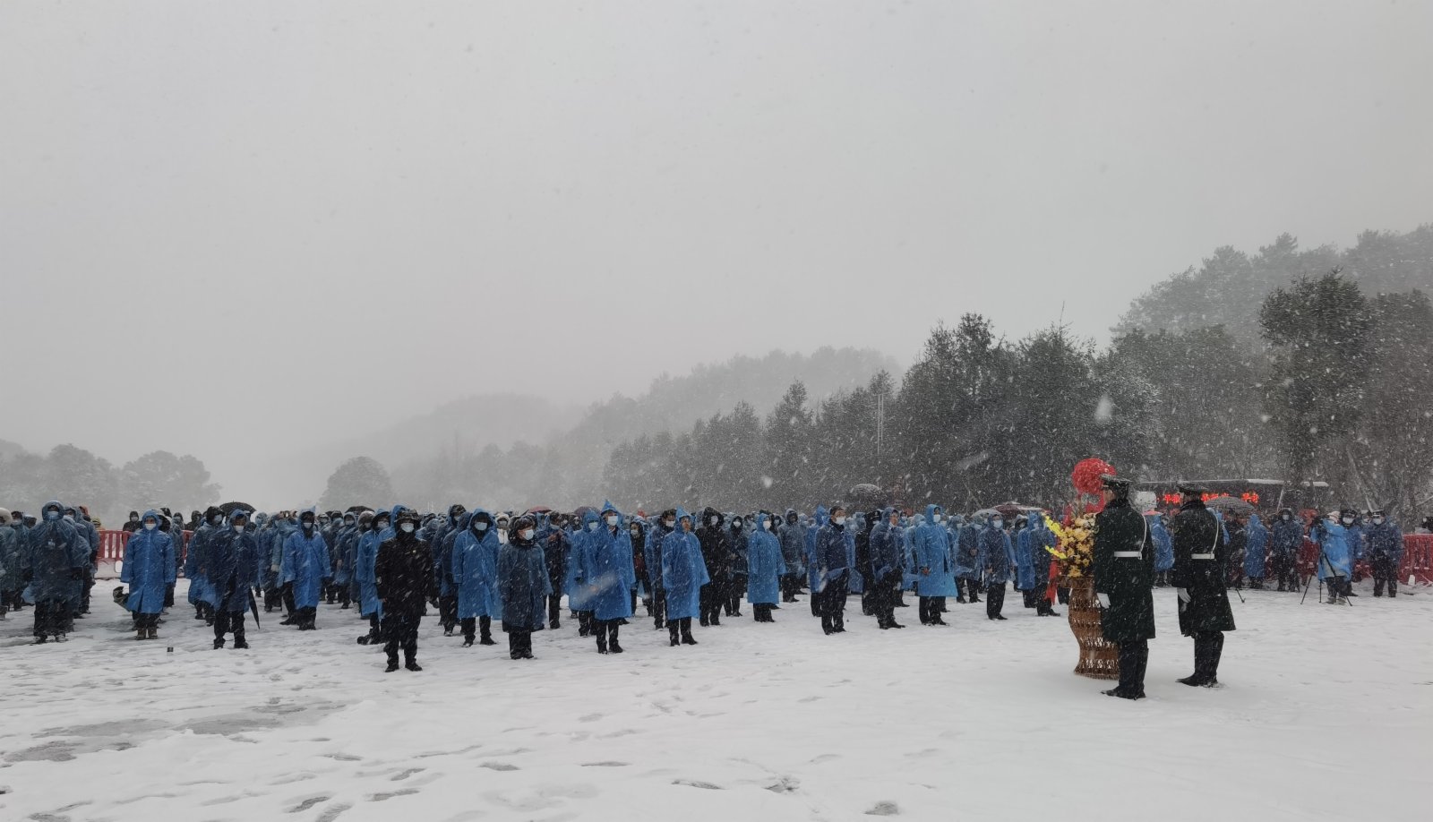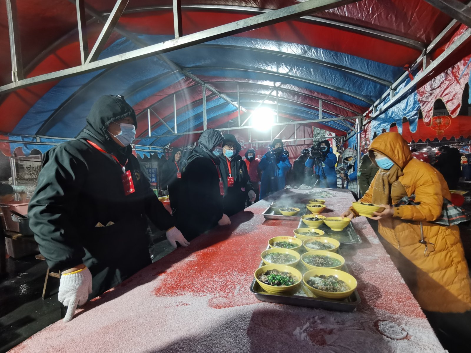 早上6點,天還未亮,韶山村村部大樓前坪燈火通明,近百張桌椅整齊地擺放着。在臨時搭建的棚屋裏,熱情的鄉親們正緊張地忙碌着,熟練地做臊子、下麵條。突如其來的鵝毛大雪並不能減弱群眾的熱情,特意趕來吃福壽麵的人們在白雪皚皚的場地外排起了長龍,翹首以盼。