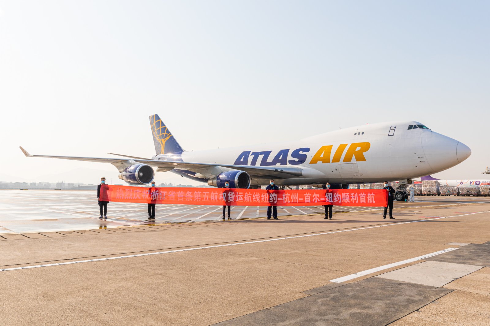 當日09:42,美國紐約飛來的全貨機航班5Y551降落杭州機場,隨後經過兩個小時的裝卸,83.75噸電商貨品將從杭州機場起飛,1.64噸貨物前往韓國首爾,82.11噸貨物前往美國紐約。該航線由順豐國際包租美國阿特拉斯航空運力執行,使用波音747-400F全貨機執飛,航班初期每周1班,後期將逐步加密班次量。和以往不同的是,此次航線將杭州機場作為中轉站,通過利用中、美、韓三國之間的國際航權第五業務權(簡稱第五航權),實現杭州、紐約和首爾三地機場間自由上下貨物並靈活分配貨物。