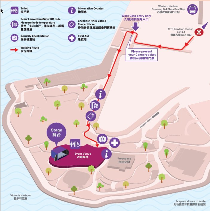 此次演唱會會場只設一個入口位,觀眾可以於港鐵九龍站E4出口沿步行路線往西九龍文化公園西閘入口前往會場。(下附入場指示圖)