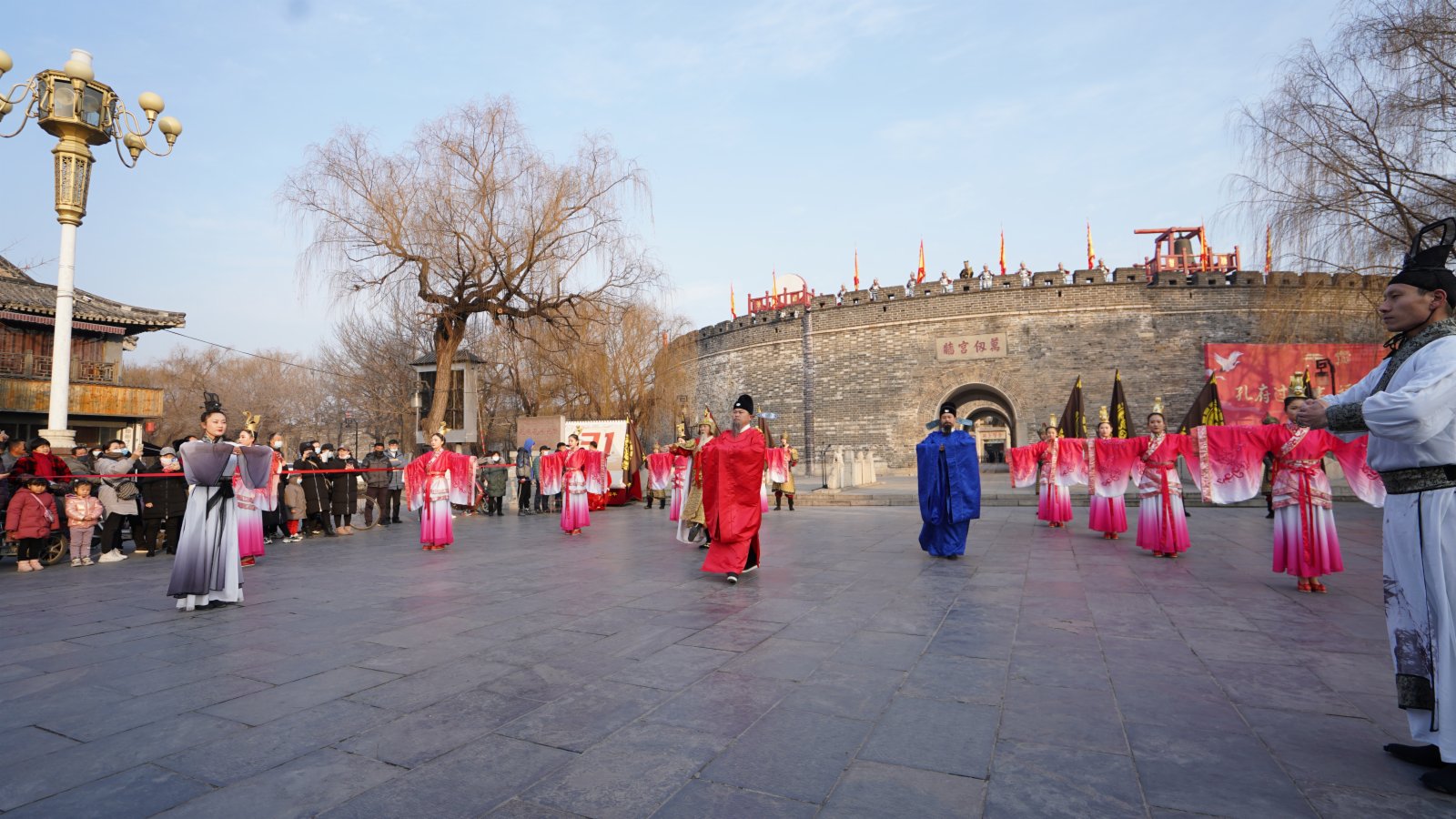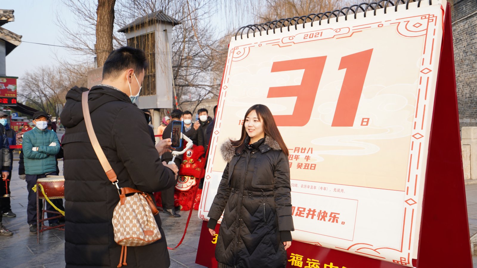 八點半,祈福鐘聲敲響,開城儀式正式上演。「聽威風鑼鼓聲響,看舞龍舞獅矯健」,大家通過非遺展演的形式追尋儒家文化中的新春儀式感。隨着「溫2021,知2022」巨型日曆的揭開也拉開了新年序幕,「福祿壽」三星將裝有祭祀聖果、糕點、竈糖、福卡的福袋和新年好福氣傳遞給現場遊客。