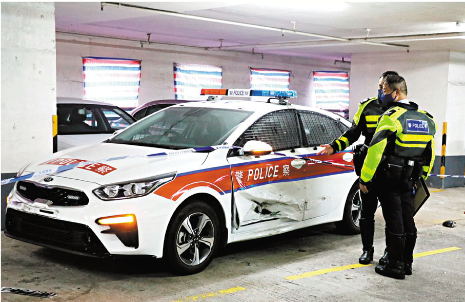 香港文匯報訊(記者 蕭景源)一輛未掛車牌的黑色豐田私家車,昨日下午3時許駛入紅磡崇安街半島廣場停車場,保安員認為有可疑,暗中報警。當警車到場駛至6樓,兩警落車擬上前截查該輛可疑私家車時,詎料對方突然狂踩油門倒車,猛撞向警車車頭及左邊車門致嚴重毀爛,警車被撞時更波及側邊一輛寶馬房車,幸兩警及時閃避,警員並即時拔出佩槍戒備,惟此時可疑私家車已高速沿停車場逆線而下,更在5樓迎頭擦撞一輛物流客貨車的左邊車身,其後再飆至停車場出入口撞閘逃去。