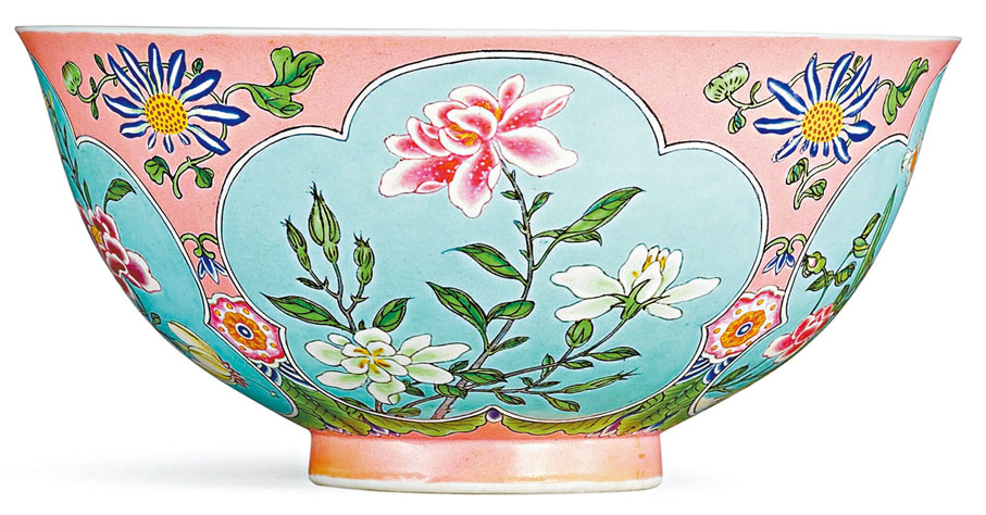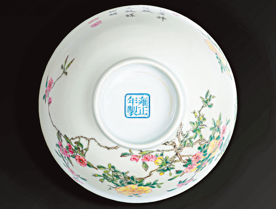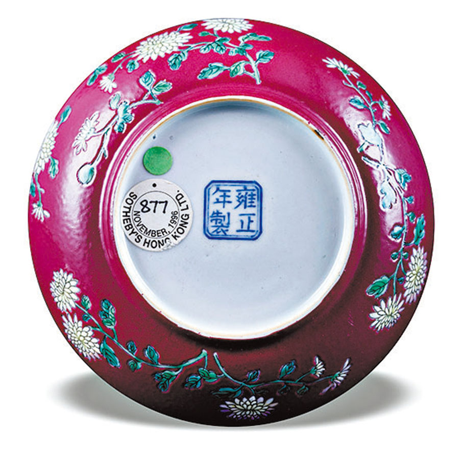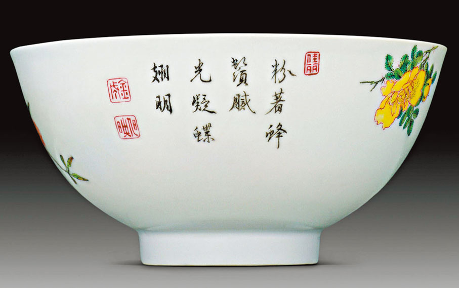 雖然開頭提及的幾件拍賣品都屬乾隆一朝,但若論瓷器收藏家的心目中可遇不可求的珍物,乃是極少在拍賣場上出現、鳳毛麟角般的雍正琺瑯彩。雍正琺瑯彩小件器在潔白的瓷胎上描繪花鳥、竹石、山水等,題詩兩句並加印圖章,構圖與傳統中國畫相同,畫風秀美;然而彩畫所採用的進口「多爾門」油調和釉彩,紋飾有晶瑩透明的玻璃質感,營造出類似油畫的效果。而雍正嚴格謹慎的性格,亦讓雍正琺瑯彩的工匠水準及藝術造詣達到了巔峰,燒造出構圖極其精美而高雅的瓷器。瓷胎畫琺瑯的款識均署在器物外底,大多為四字雙行紅色或藍色圖章式堆料款,圍以雙方框,框線外粗內細,「料款」比起一般的「青花款」更有玻璃般的亮澤感。筆者亦收藏了一件「古月軒」雍正御製琺瑯彩月季海棠圖碗,一面為精細勾勒的月季海棠圖,另一面則題詩兩行,整體畫風簡潔而雅致,為本人的收藏系列增色不少。●作者:香港中華文化藝術推廣基金主席 李秀恒