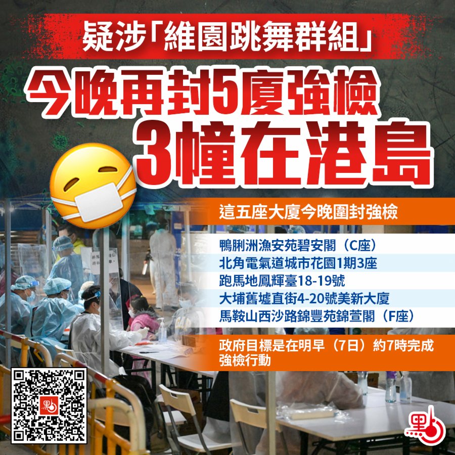 政府表示,自今晚7時起圍封鴨脷洲漁安苑碧安閣(C座)進行強制檢測,受檢人士須留在其處所並接受強制檢測,政府目標是在明早(7日)約7時完成此行動;自今晚7時05分起圍封北角電氣道233號城市花園1期3座(不包括位於城市中心商場地下、1樓及2樓的商鋪)進行強制檢測,受檢人士須留在其處所並接受強制檢測;自今晚7時30分起圍封跑馬地鳳輝臺18-19號進行強制檢測,受檢人士須留在其處所並接受強制檢測;自今晚8時起圍封大埔舊墟直街4-20號美新大廈(不包括位於美新大廈地下的商鋪及1樓至3樓的安老院)進行強制檢測,受檢人士須留在其處所並接受強制檢測;自今晚10時起圍封馬鞍山西沙路錦豐苑錦萱閣(F座)進行強制檢測,受檢人士須留在其處所並接受強制檢測。