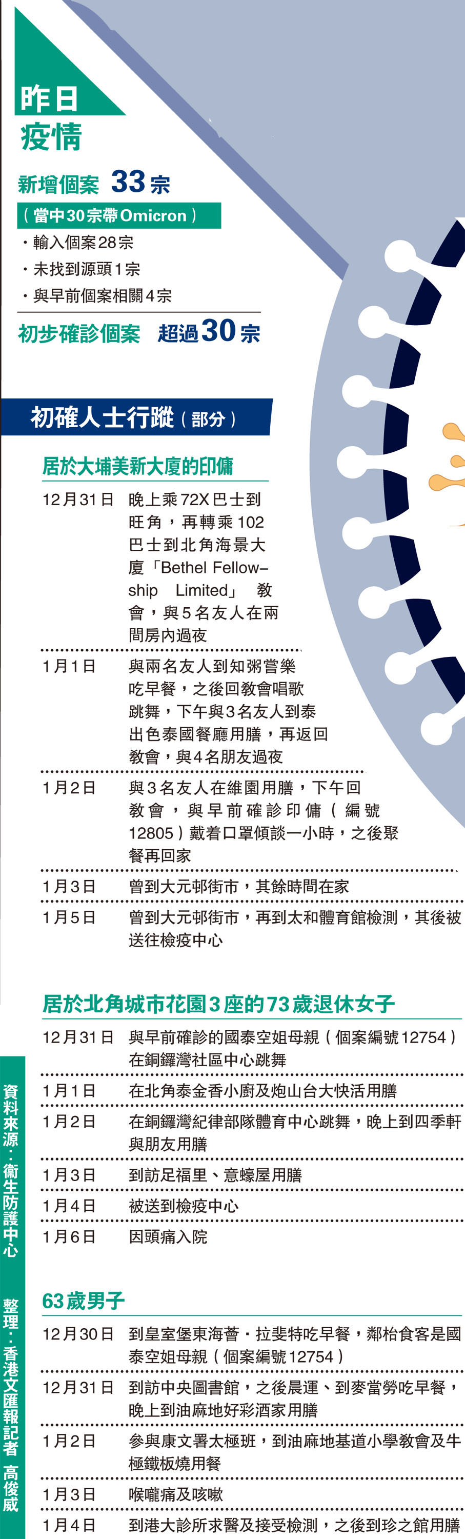 香港特區昨日新增33宗確診個案,帶Omicron個案多達30宗,特區政府昨晚圍封五區。在昨日全港30宗初步確診中,有3宗與空姐母親有關,包括其朋友外傭的外傭友人,與其在同一社區中心跳舞的73歲女子,以及與其在同一酒樓同場用膳的63歲男子均受感染。