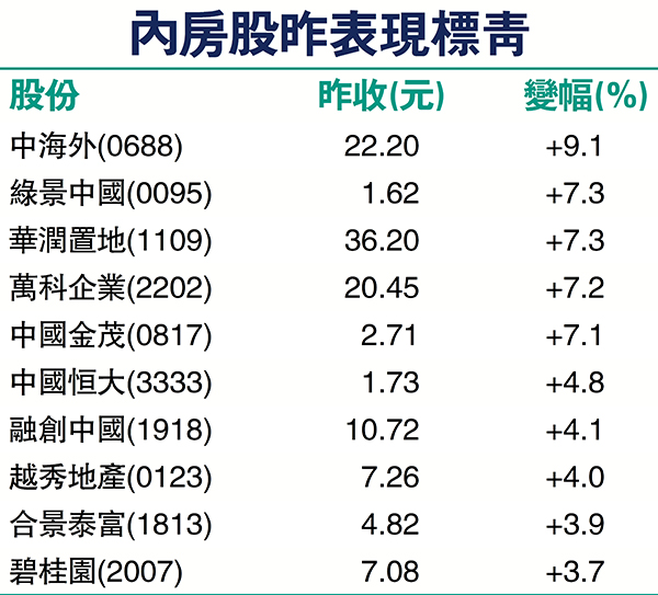昨日一眾大型內房企業上升,其中以中海外昨表現最為亮麗,急升逾9%,收報22.2元,是表現最好的藍籌股。華潤置地升7.26% ,收報36.2元,是表現第二好的藍籌股。此外,萬科(2202)升7.18%,收報20.45元;碧桂園(2007)升3.66%,收報7.08元。