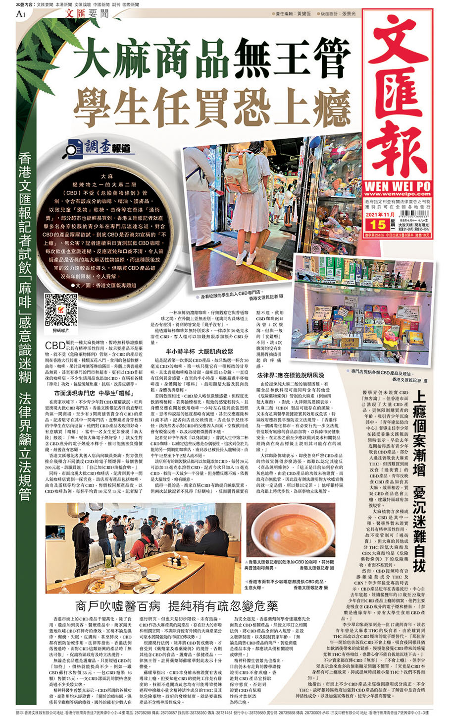 大麻是毒品!香港文匯報於去年11月踢爆市面出現掛羊頭賣狗肉,有店舖出售自稱含合法大麻二酚(CBD)的產品,實質卻含違禁危險藥物四氫大麻酚(THC)成分。其後,警方和海關多次採取掃蕩行動,拘捕多人包括「港獨」分子張子龍。警方根據情報,上周五(7日)再於葵芳葵涌廣場一店舖檢獲逾300件疑含THC成分的香薰精油及沐浴用品,另又檢獲逾800件標明含有大麻或大麻油的糖果及蛋糕等,全部總值約4.5萬元,3名男女包括負責人及一名年僅15歲女學生被捕。◆香港文匯報記者 蕭景源