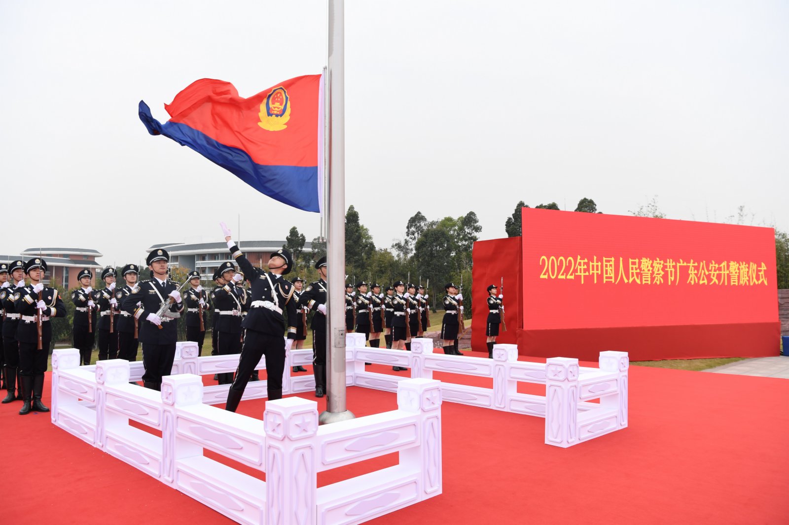 上午10時整,升警旗儀式正式開始,現場奏響雄壯的《中華人民共和國國歌》,主會場和全省各地分會場參加儀式的民警高唱國歌。儀仗隊員邁着鏗鏘有力、整齊劃一的步伐,護衛着警旗正步走向升旗台。伴隨着嘹亮的中國人民警察警歌,鮮艷的中國人民警察警旗冉冉升起、迎風飄揚。參加儀式民警身着警禮服,向警旗註目敬禮。隨後,在廣東省副省長、省公安廳黨委書記、廳長王志忠的帶領下,全體民警重溫《公安機關人民警察誓詞》。