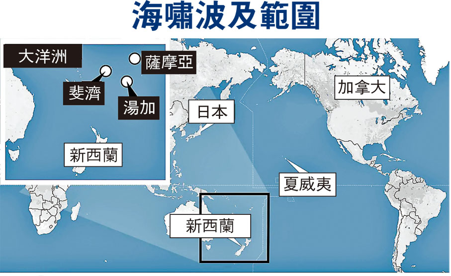 綜合報道,南太平洋島國湯加的洪阿哈阿帕伊島在14日及15日接連發生海底火山噴發,並在太平洋引發海嘯,秘魯遭到2米高海嘯侵襲,據報造成最少兩人死亡。日本及美國等多個太平洋沿岸國家均發出海嘯預警,並錄得最高約1米多的海嘯。至於首當其衝的湯加,對外通訊幾近全面中斷,難以知道受災及傷亡情況,但相信海嘯和火山灰已經對當地造成嚴重破壞。專家警告,由於事發火山口已經甦醒,未來數周甚至數年可能會持續發生更多噴發,而且不肯定當前的噴發是否已經達到最高峰。