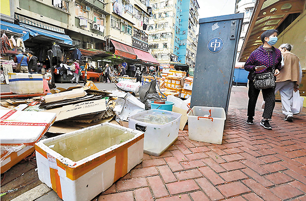 香港文匯報記者昨日到區內北河街、鴨寮街、桂林街及福榮街一帶多個地方巡查,發現衞生問題處處。首先,區內排檔、地攤眾多,人來人往之餘街上雜物處處,有街市外的地上放滿紙皮,亦有發泡膠盒盛載滿瀉的污水。在北河街街市附近的舊樓後巷中,亦發現污水遍地,且因渠管滲漏而出現污水從天飛濺的情況,令路過者也觸目驚心。縱使區內其他一些衞生情況較理想的後巷,仍看到一些渠管因日久失修而鋪滿青苔鐵鏽,且時有滲漏情況,一旦污水內有病毒,同樣容易造成傳播。