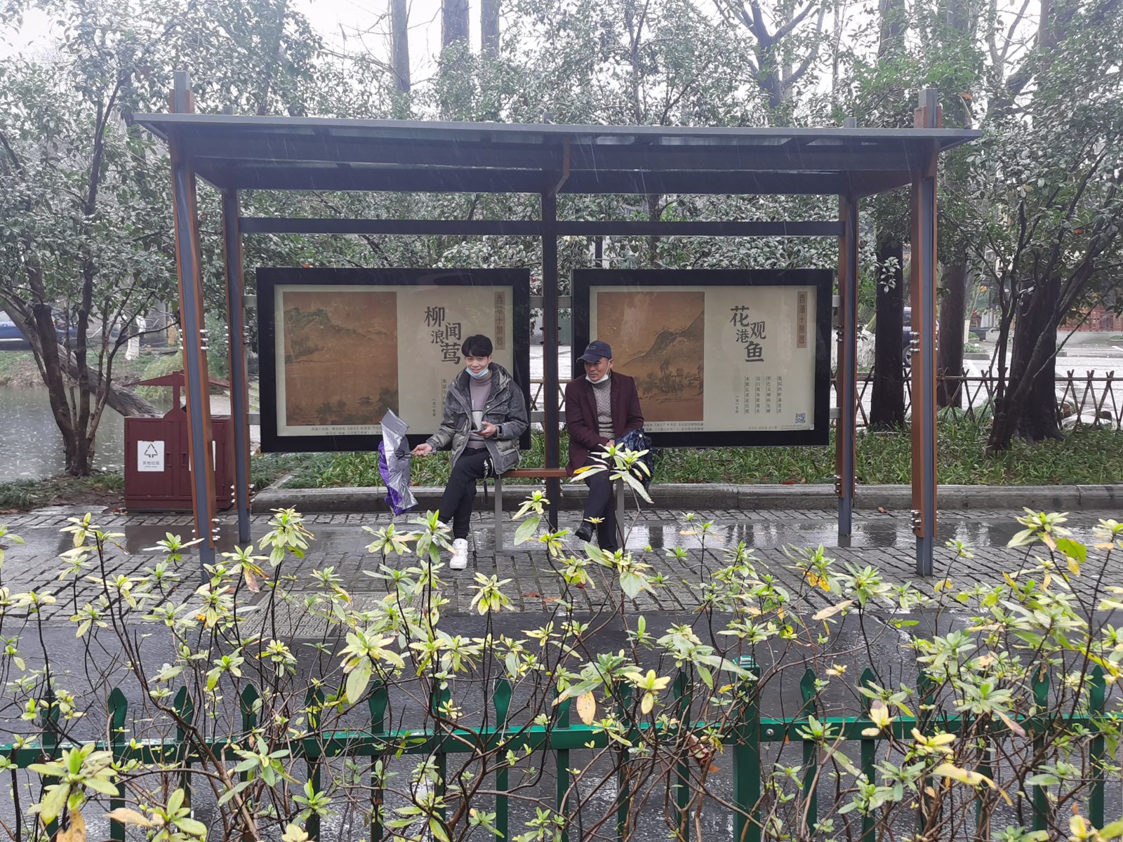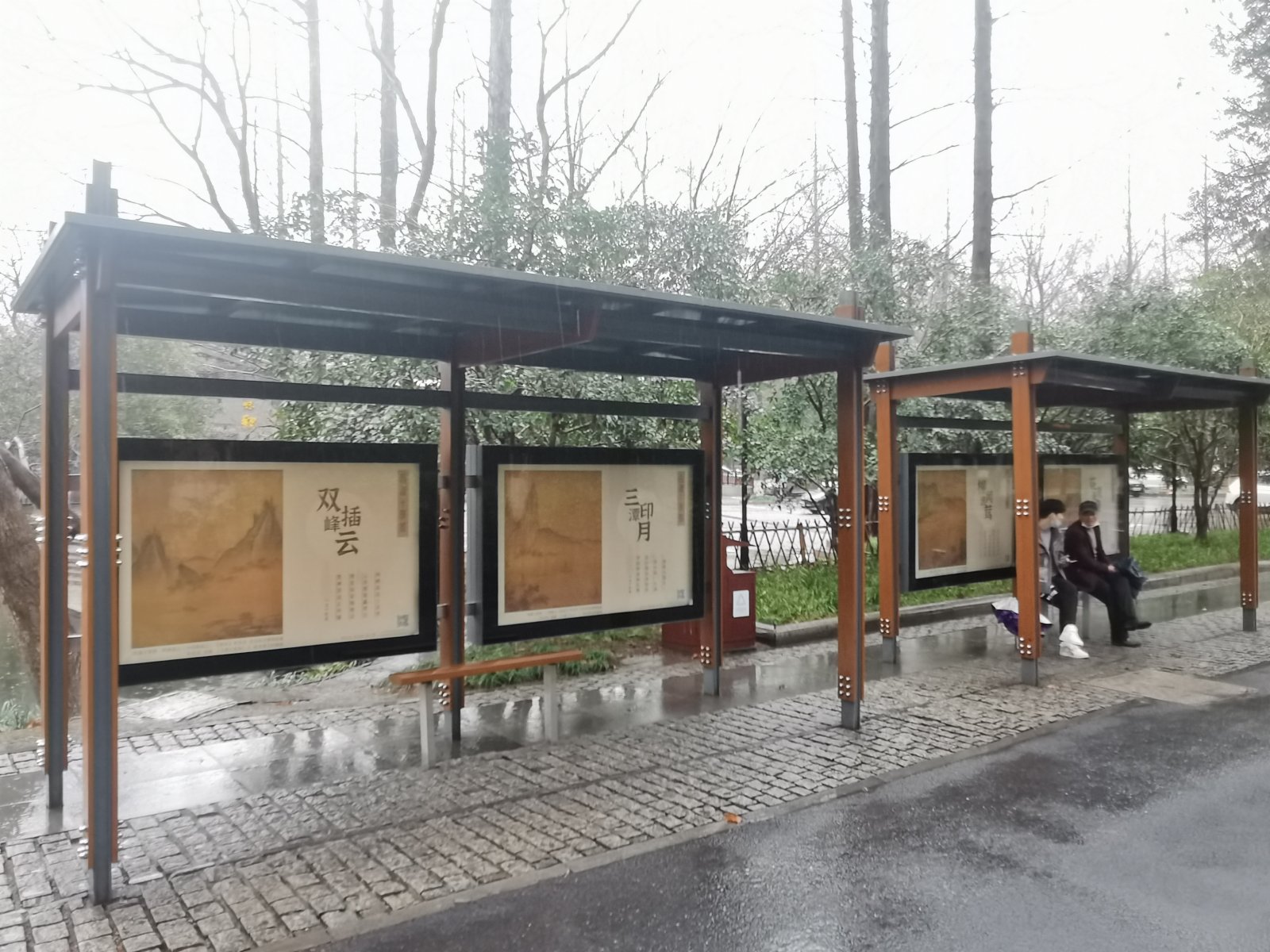 此次在公交站台展示的是宋理宗時畫師葉肖岩的《西湖十景圖》。這套《西湖十景圖》一共十幅,根據西湖十景題名,結合地景特色,傳達各景點不同季節所展現的清麗風貌。