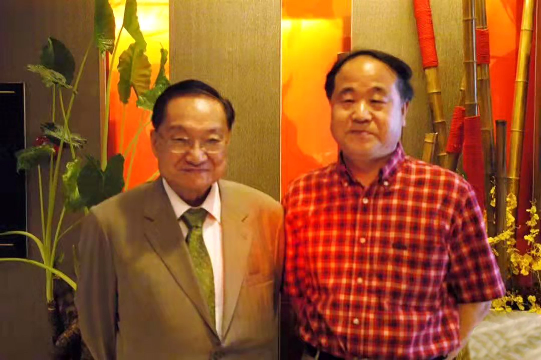 接下來,一首七絕,一首七律,都題做「莫言作詩憶金庸」。莫言在第一首詩中寫到「大俠初逢魏公村,香江投帖拜師門。高人多說家常話,擒虎屠龍不足論。」生動憶述了自己與金庸見面時相談甚歡的情景。七律則寫到「仗劍負書天下行,凌雲壯志寶刀橫。紅顏翠袖西夏夢,大馬長槍蒙古營。香港明珠百歲盛,神鵰俠侶千秋名。君乘仙鶴浮霄漢,遺憾人間未了情。」在這首詩裏,莫言也對金庸的文學成就與貢獻給出了高度評價。