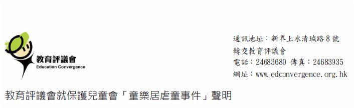教育評議會因應事件,曾於本月8日發出聲明,要求特區政府嚴肅跟進事件。因應虐童情況發現的進一步擴大,教育評議會再作出嚴正聲明,要求特區行政長官嚴肅處理童樂居虐童事件,責令及督促相關部門及人員,承擔嚴查事件及保護兒童的基本責任,避免無助的嬰幼兒繼續受到進一步傷害;要求勞工及福利局盡快成立獨立調查委員會,審查社會福利署、保護兒童會及童樂居各相關人員在虐童事件的關連責任;現階段童樂居已有20名幼兒工作員被拘捕,一半嬰幼兒發現被虐。童樂居內未被發現被虐的,可能只是鏡頭未觸及、或未及保存、或未夠清晰,或已是疏忽照顧多時;基於保護兒童身心正常及健康發展的必須,社會福利署署長作為大多數無助兒童的法定監護人,社會福利署需要迅速轉移全體兒童至可安全健康照護的院舍。