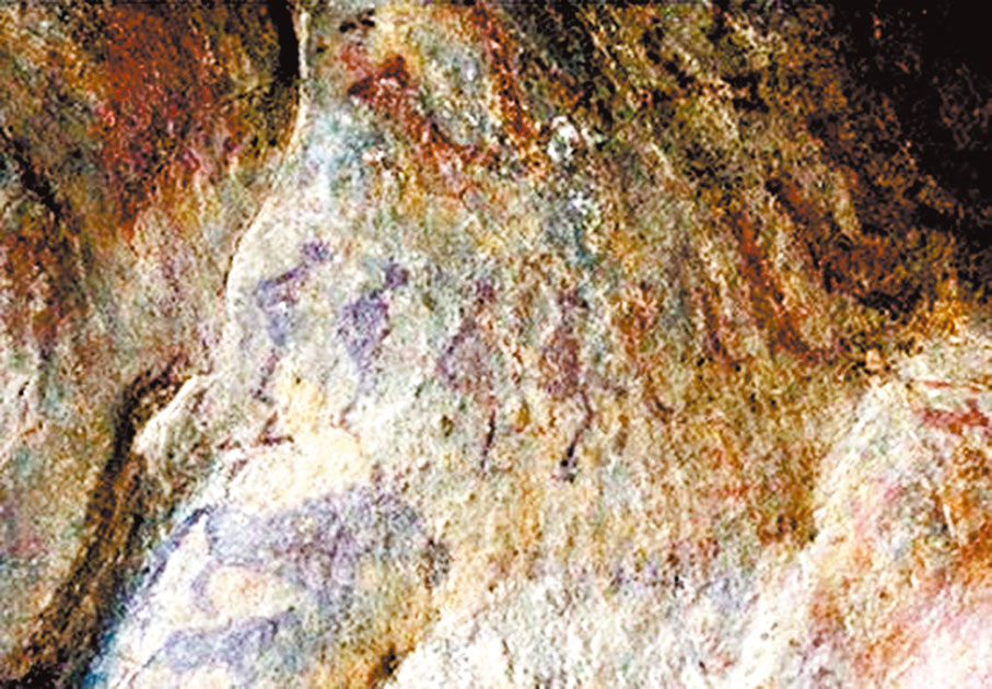 這幅岩畫彷彿在講述着一個故事:很久以前,這裏齊腰厚的雪讓人們難以得到過冬裹腹的糧食,於是聰明的獵人就想到了一個辦法,將毛皮綁在長長的木板上,借助慣性力量,在雪山中滑行,獵捕野兔、野山羊……這處岩畫被稱為墩德布拉克洞穴彩繪岩畫。