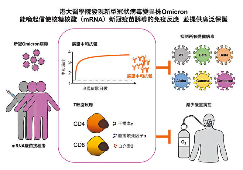 港大醫學院研究團隊針對兩宗本地已接種復必泰疫苗但仍感染Omicron的患者的中和抗體進行了全面及定量的比較,發現他們體內所誘導出針對Omicron的中和抗體,從一開始低於檢測值水平,在染疫後快速上升至比一般疫苗接種者高出75倍,而新喚起的中和抗體對不同病毒變種都有增強的中和活性,同時患者的抗原特異性T細胞免疫反應也有所增強。