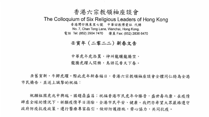 大公文匯全媒體報道:農曆新年將至,香港六宗教領袖1月27日聯合發表新春文告,祈願疫情早日消除,呼籲香港市民齊心協力共同抗疫,虎年人人安居樂業,世界和平安寧。