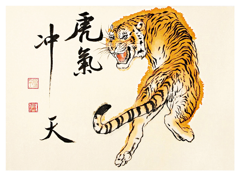 古今不少畫家都喜愛畫虎,張大千之兄張善孖就以畫虎聞名,嶺南畫派的高劍父、高奇峰、趙少昂,亦都是善於繪虎之才。徐沛之曾任職於拍賣行,見過不少名家真跡也十分欣賞,但到自己提筆,他希望與前人之作保持距離,探索適合自己的技法,畫出獨創之虎。他參考各種姿態的老虎相片,啟發奇思妙想,如「出POOL萬歲」四字,他先用橙色墨汁畫出兩個「O」字,然後在墨跡未乾時,用較濃的墨於其上勾畫老虎的眼睛與花紋,隨着下層水墨逸散,呈現出虎面毛茸茸的效果。問及其中意念,徐沛之笑稱:「把『出POOL』畫出老虎眼睛,是希望大家新一年出POOL都要帶眼識人!」