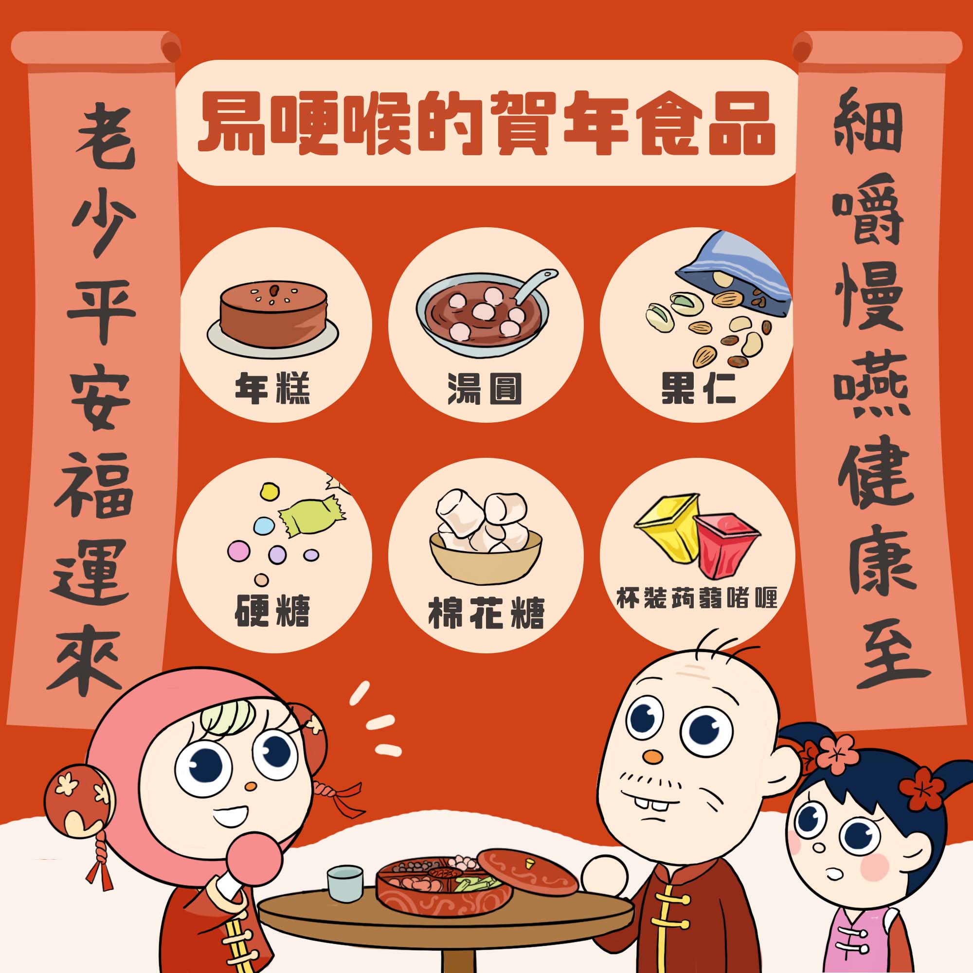 大公文匯全媒體報道:食安中心今日(1日)在facebook表示,新年面對軟糯香甜的年糕、湯圓、香脆惹味的果仁、滑嘟嘟的啫喱仔等賀年食品,如果家中有老人小孩,預備賀年食品時就要留意。因為小朋友的呼吸道及食道較細,而長者吞嚥能力可能下降,兩者咬碎或咀嚼食物的能力又不是太強,進食時一下不留神神,很容易「鯁親」,例如年糕、湯圓、果仁、硬糖、棉花糖等食物都應小心。