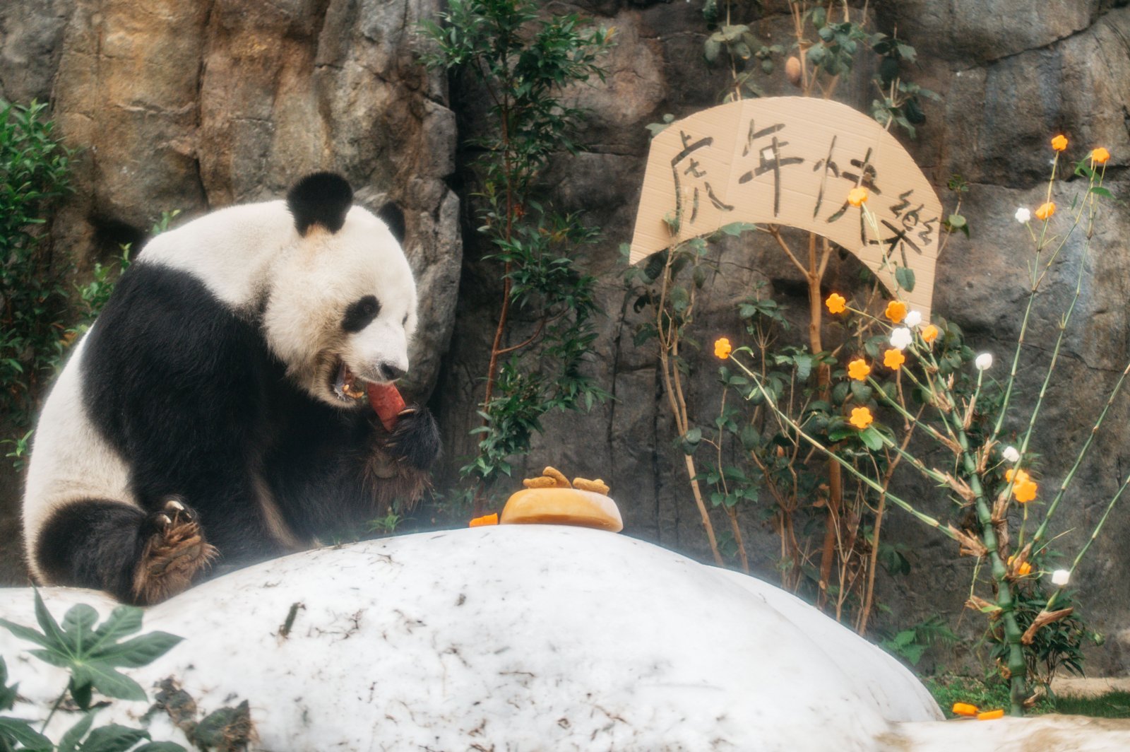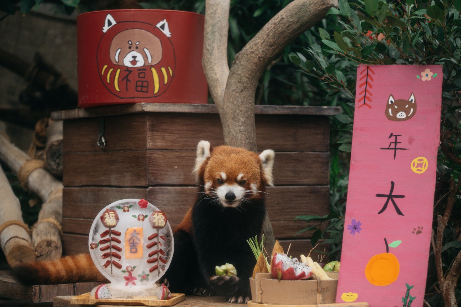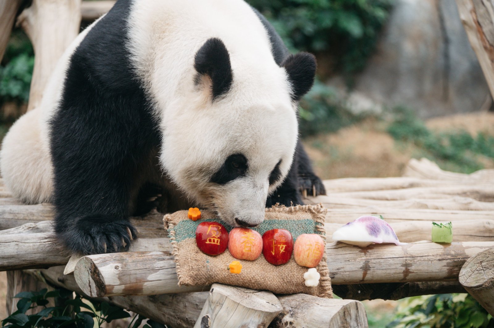 此外,居於「大熊貓之旅」和「香港賽馬會四川奇珍館」的大熊貓和小熊貓,亦在新春佳節享受了美味佳餚。大熊貓安安和盈盈享用開運賀年菜──開胃的雷竹筍作為頭盤,配以錦鯉造型的紫薯年糕和「盈」春接福吉祥蘋果。樂樂則在以紅蘿蔔和沙葛製作而成的桃花樹下享用賀年美食。
