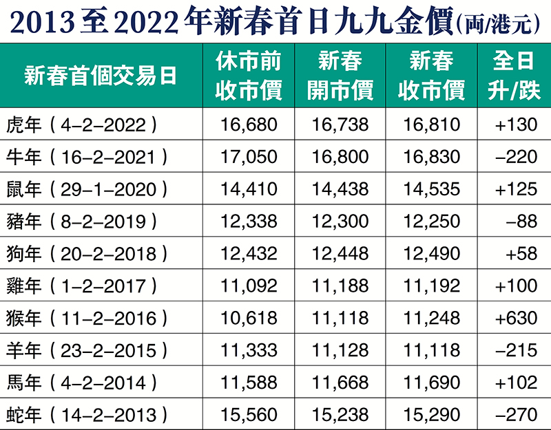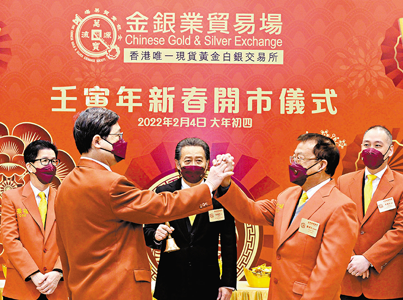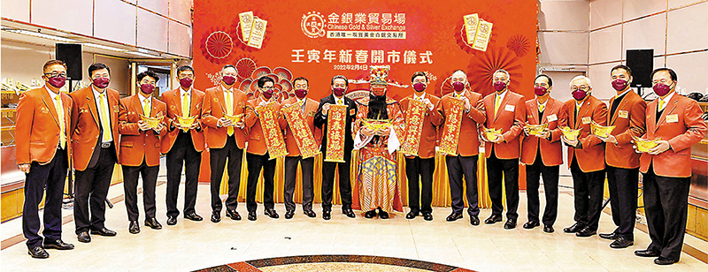 金銀業貿易場昨日舉行壬寅虎年啟市儀式,九九金在虎年首個交易日紅盤高開,第一口價為每両16,738港元,較農曆新年假期前最後一個交易日收市價升58港元或0.35%。金銀業貿易場理事長張德熙昨指,環球通脹升溫,加上地緣政治局勢等不確定性,預期今年國際金價有望進入牛市,上望每安士1,930美元。國際金價昨日每安士約1,810美元。◆香港文匯報記者 岑健樂