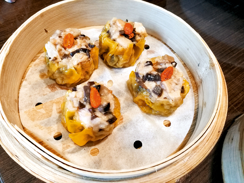 大廚Dicky設計開放式廚房,讓食客可以看到師傅包點心,點心全部每日新鮮製作,如筍尖蝦餃皇,蝦餃皮薄餡靚,入面彈牙的是素蝦,但帶出鮮味原來要用筍子,食落跟真蝦做的蝦餃是一模一樣。而香菇燒賣,他們是用植物肉,燒賣中間豬肉咬落去又是跟真燒賣一樣,口感和味道都好正。