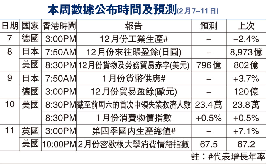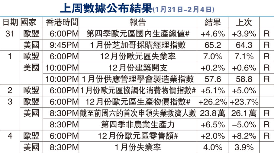 美元上周顯著走低,先是因多位美聯儲官員的講話內容以及民間就業數據疲弱,一定程度淡化了市場對美聯儲升息幅度的預期;此外,英國央行升息以及歐洲央行立場轉為鷹派,則分別推升了英鎊及歐元,並相應給予美元進一步壓力,同時亦支撐金價緩步走高。ADP周三公布的就業報告顯示,多個行業就業崗位都意外下降,民間就業崗位1月減少30.1萬個,這是自2020年12月以來首次下降;雖然數據不太可能阻止美國聯邦儲備理事會(FED)在3月15至16日的政策會議上升息,但降低了對大幅加息0.5個百分點的預期。至上周五,在強預期的非農就業數據公布後,金價一度挫跌逾20美元,觸低至1,791.50,但之後已見扳回大部分跌幅。美國勞工部公布,美國1月非農就業人數增加46.70萬,勝於15萬的預期增幅;失業率上升至4%,上月為3.9%;薪資年率大幅上升至5.7%,上月增幅為5.0%。數據加劇了人們對通脹的擔憂,並打擊投資者的風險情緒,澳元、紐元等商品貨幣於周五出現顯著回跌,而受通脹壓力支撐的金市則呈拉鋸走勢。