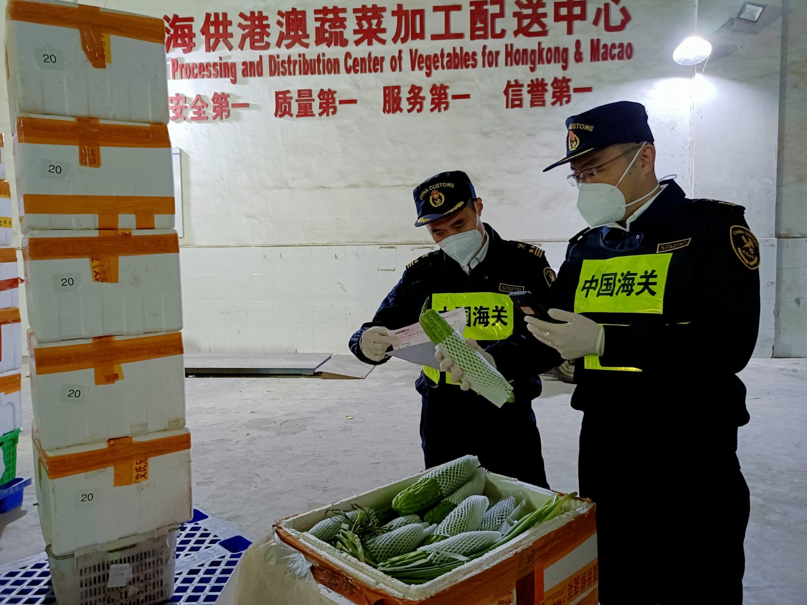 「供港澳蔬菜保鮮期短、供應急,採取的是『種植基地-加工廠-港澳市場』的連續直供方式,即使春節期間也幾乎無一日停歇,且為趕早市通關,都是夜晚裝車發貨。」拱北海關所屬香洲海關查檢科工作人員表示:「我們的查檢作業時間一般都是在夜間,全年無休。」
