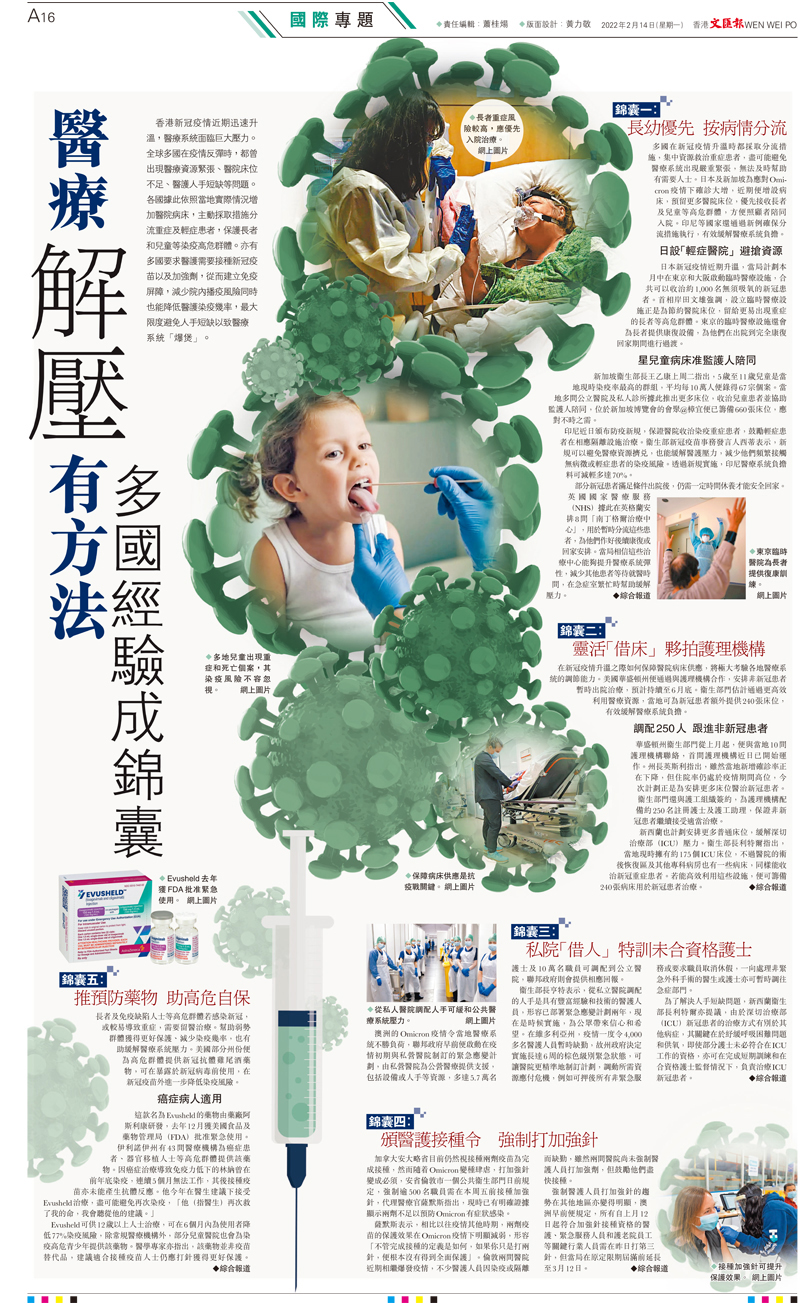 (香港文匯報綜合報道)香港新冠疫情近期迅速升溫,醫療系統面臨巨大壓力。全球多國在疫情反彈時,都曾出現醫療資源緊張、醫院床位不足、醫護人手短缺等問題。各國據此依照當地實際情況增加醫院病床,主動採取措施分流重症及輕症患者,保護長者和兒童等染疫高危群體。亦有多國要求醫護需要接種新冠疫苗以及加強劑,從而建立免疫屏障,減少院內播疫風險同時也能降低醫護染疫幾率,最大限度避免人手短缺以致醫療系統「爆煲」。