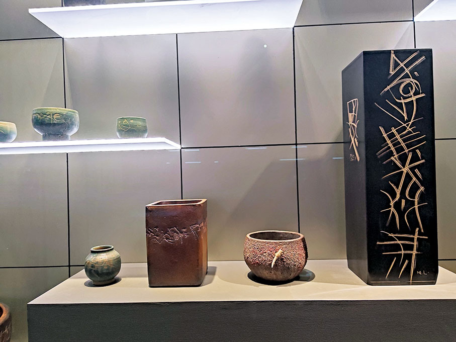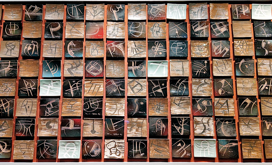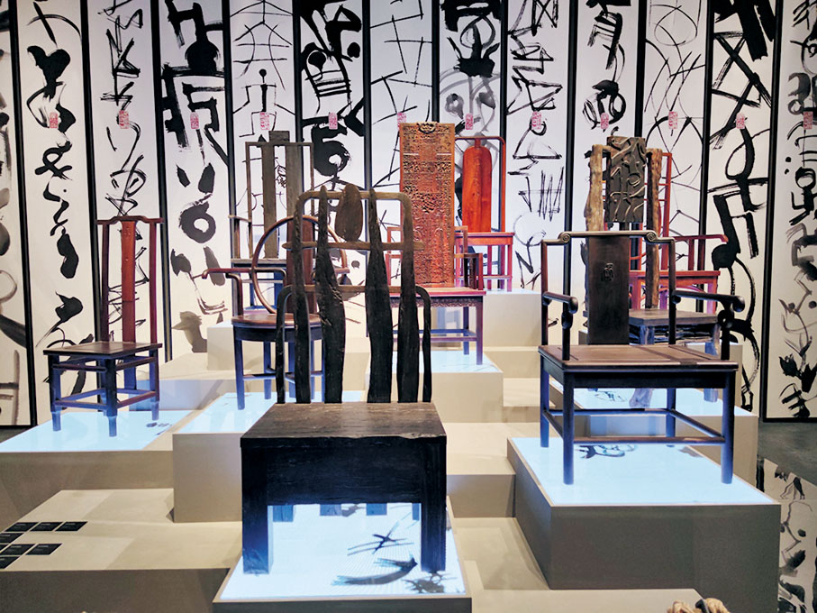 「遊於藝,競自由」單元則從民間傳統文化與圖形符號中啟發天書的想像力,將「天書」拓展至水墨、陶瓷、紫砂、印染、木雕、鐵藝等各個領域——陶瓷瓶、陶瓷盤、紫砂壺,甚至是以古代文字符號為型設計的「天書椅子」等日常生活器物同天書藝術完美融合,要的不再是形而是神,不再是體而是魂,鍛造了「天書」特有的文化精神與時代魂魄。