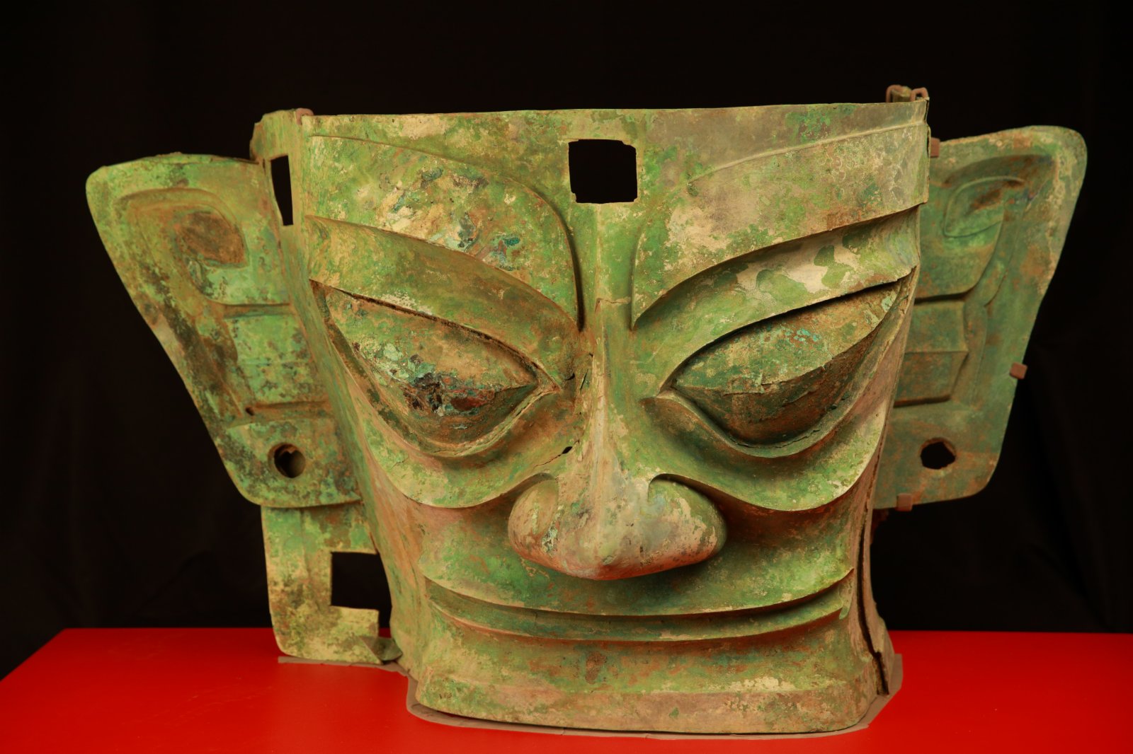 青銅面具是三星堆文化中最具特色的典型器物,應是陳置在神廟中供人膜拜的神器。這件青銅面具寬131cm、高71cm、深66cm,重131斤,是目前三星堆遺址出土的一件形制最為完整、體量最大、保存最完好的大型青銅面具,其寬頤廣額,面龐誇張,眉、眼、鼻、唇、耳等線條流暢,稜角分明。