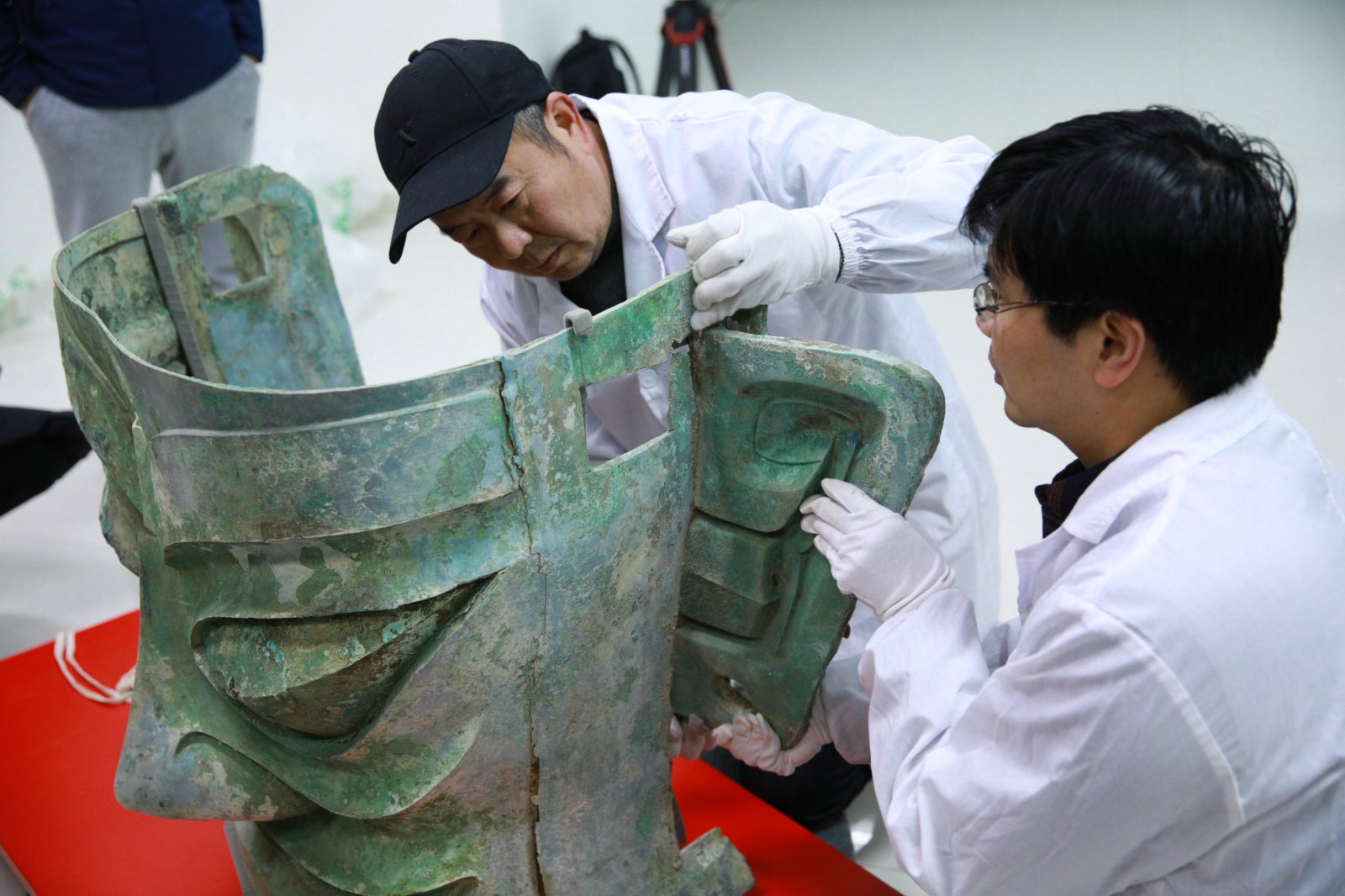 面具提取後,文保人員對青銅大面具的鑄造工藝進行了分析研究,並在右眼眉、右眼球、右眼角均發現有經緯組織的絲綢紡織殘留物。經研究,其製作先分鑄成型,由面部、臉頰後部、眼睛、耳朵等多部位分別鑄造,再焊接組合成一體,這既是青銅技術與藝術的完美結合,也是古蜀人精神世界的獨特表達。
