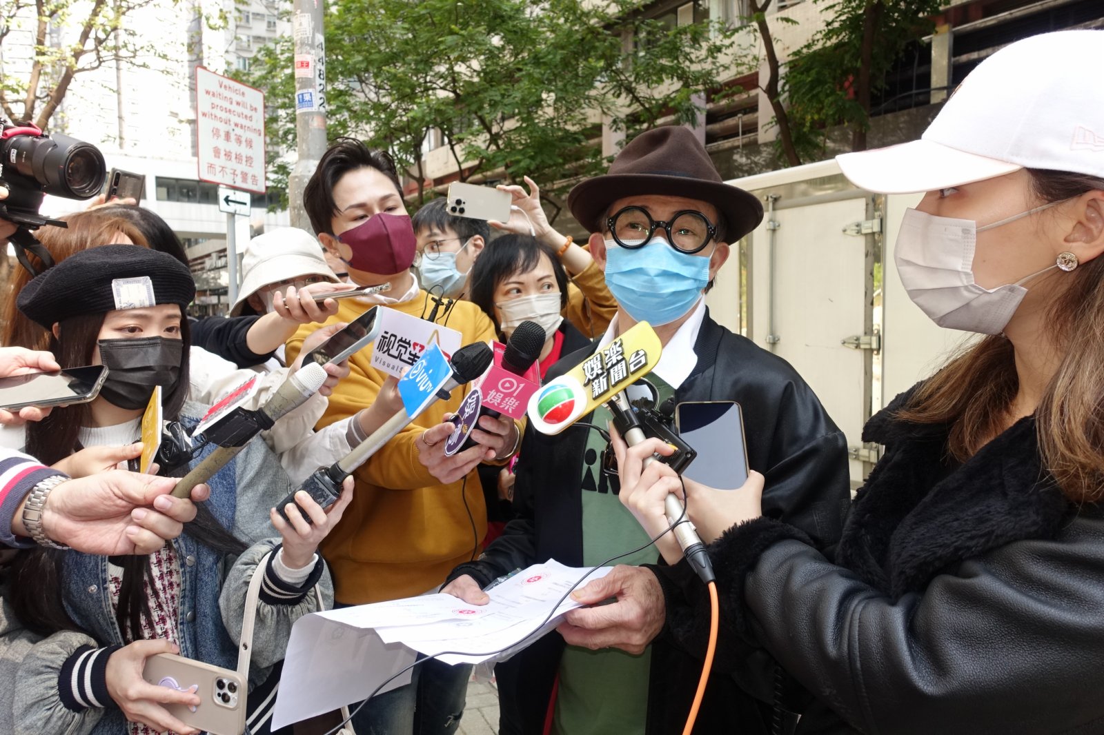 梅啟明今日在北角街頭舉行記者會,現場有近30名傳媒到場採訪,由於疫情嚴竣和限聚令關係,其間有警員到場了解後離去。戴上口罩的梅啟明手持大疊文件現身,訪問期間他多次咳嗽,但就自稱已接種好三劑疫苗,以及做過快速測試。