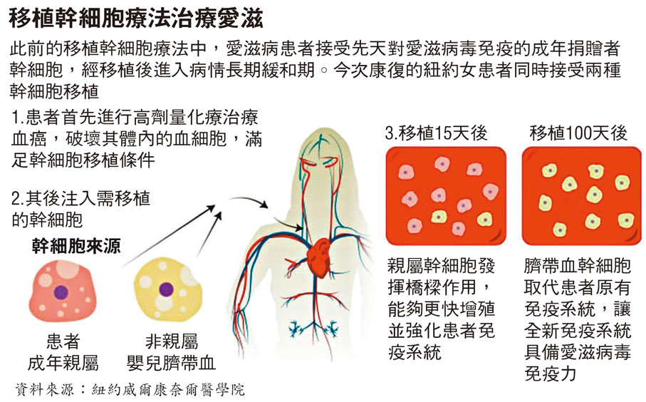 如何治癒愛滋病是長年困擾醫學界的難題,一種幹細胞移植療法正為此帶來希望。美國一項新公布的研究顯示,一名女性愛滋患者接受對愛滋病毒(HIV)有免疫力捐贈者的幹細胞移植後,已於前年10月停止服用抗愛滋藥物,且體內再未檢測出愛滋病毒。這也成為全球第3宗、且是首宗女性感染愛滋康復個案,讓醫學界尋找治療愛滋的方法更進一步。