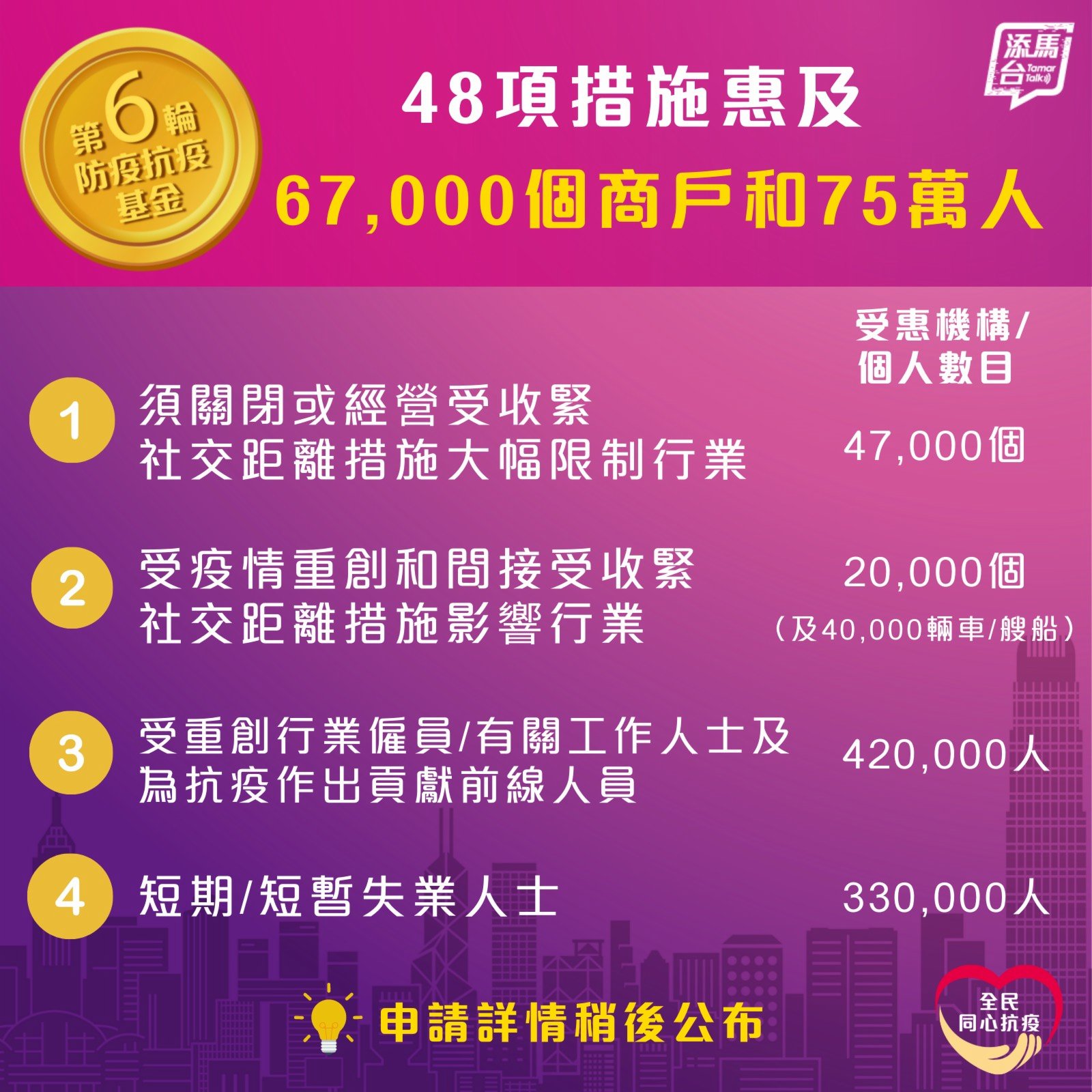 第六輪「防疫抗疫基金」共涉48項措施,連同20%應急費,總金額達270億元,僅次於第一輪的300億元及第二輪的1375億元規模。本輪基金料有6.7萬商戶、75萬人和約4萬架車輛和船隻的經營者受惠。