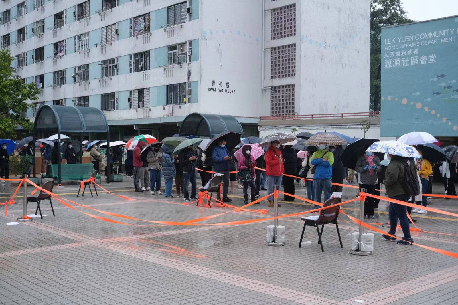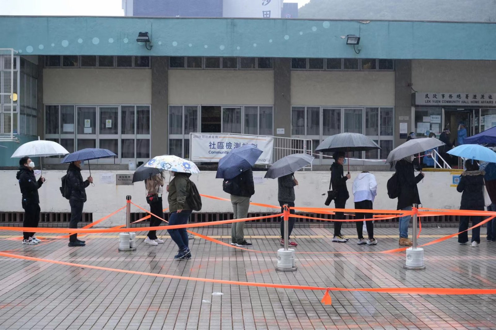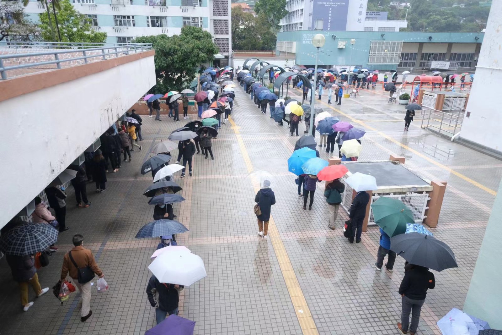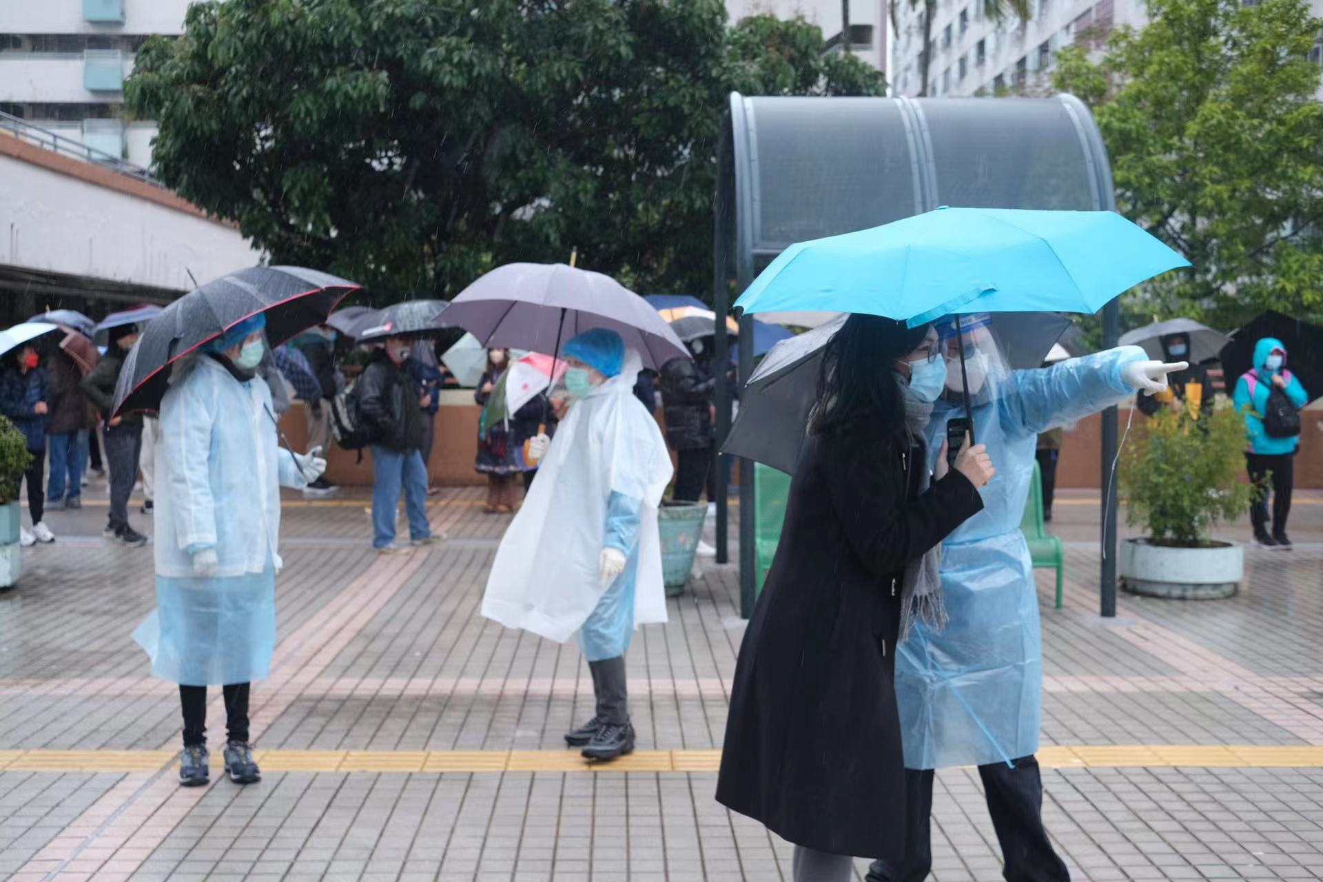 今早天氣寒冷,但仍有不少市民包括長者,冒雨前去排隊等候接受檢測,其中在沙田瀝源社區會堂,下午時有數百人在會堂外排隊等待攞籌。