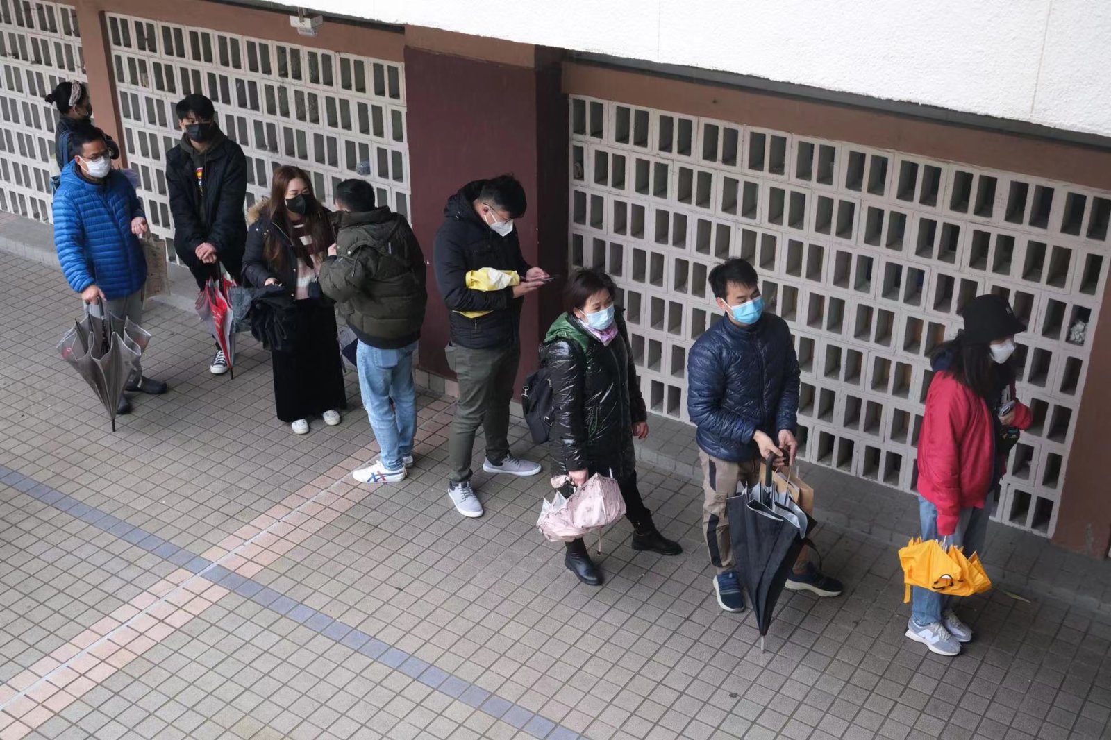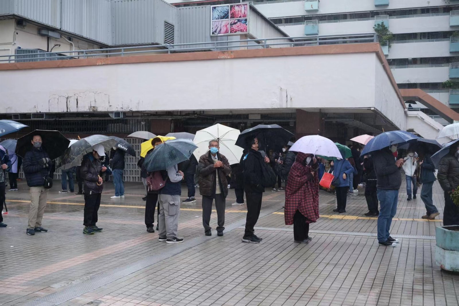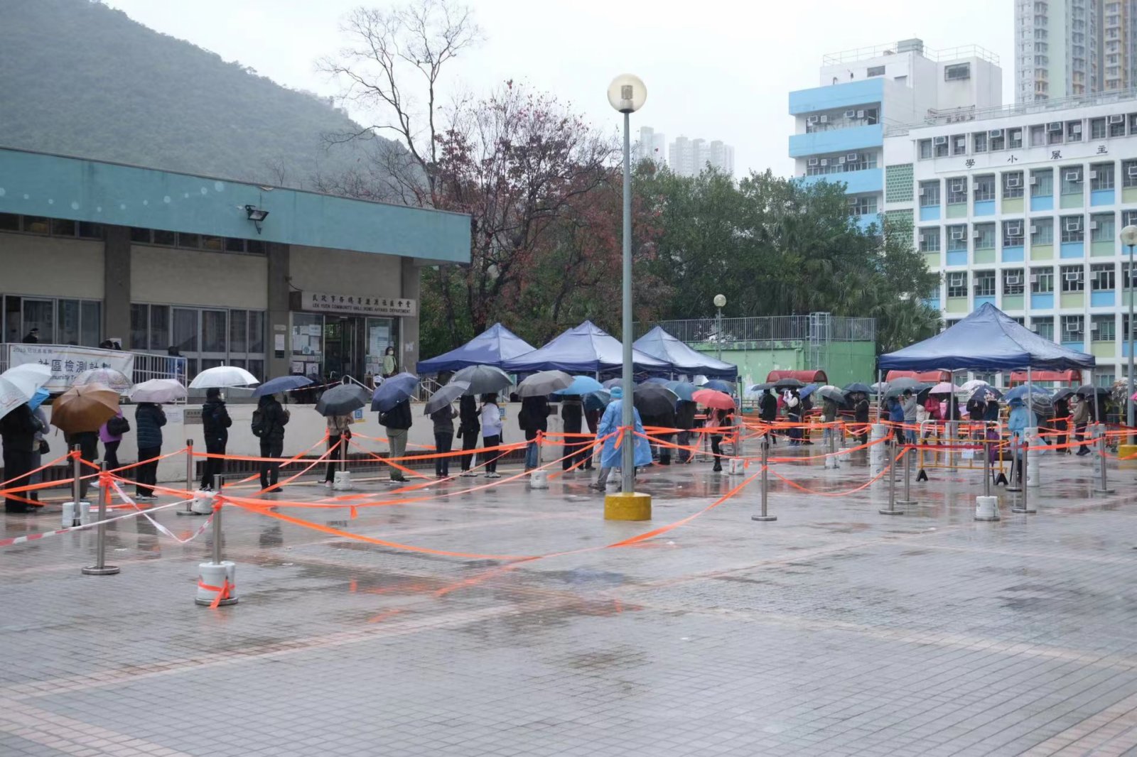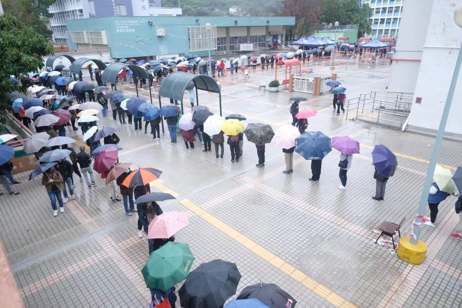 今早天氣寒冷,但仍有不少市民包括長者,冒雨前去排隊等候接受檢測,其中在沙田瀝源社區會堂,下午時有數百人在會堂外排隊等待攞籌。