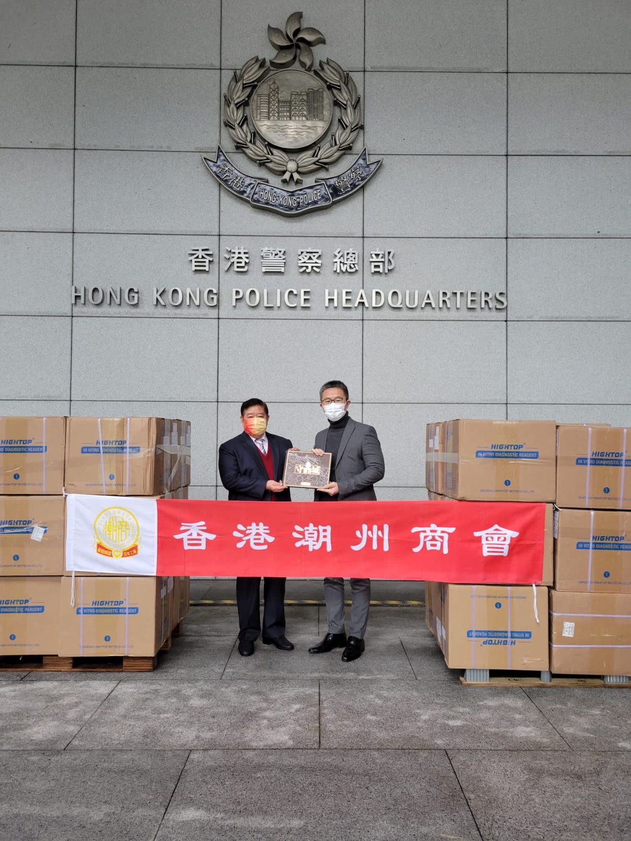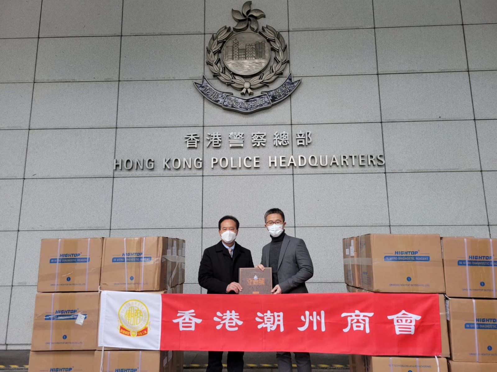 身兼警務處「耆樂警訊」中央諮詢委員會委員的香港潮州商會會長黃書銳,以及身兼警務處「守護動物」中央諮詢委員會委員、西區耆樂警訊主席的香港潮州商會常務會董謝喜武,分別認購當中1.25萬盒快速檢测盒,並出席在香港警察總部舉行的捐贈儀式。香港警務處處長蕭澤頤、助理警務處長陳綺麗、總警司馮少蘭等亦有出席儀式。