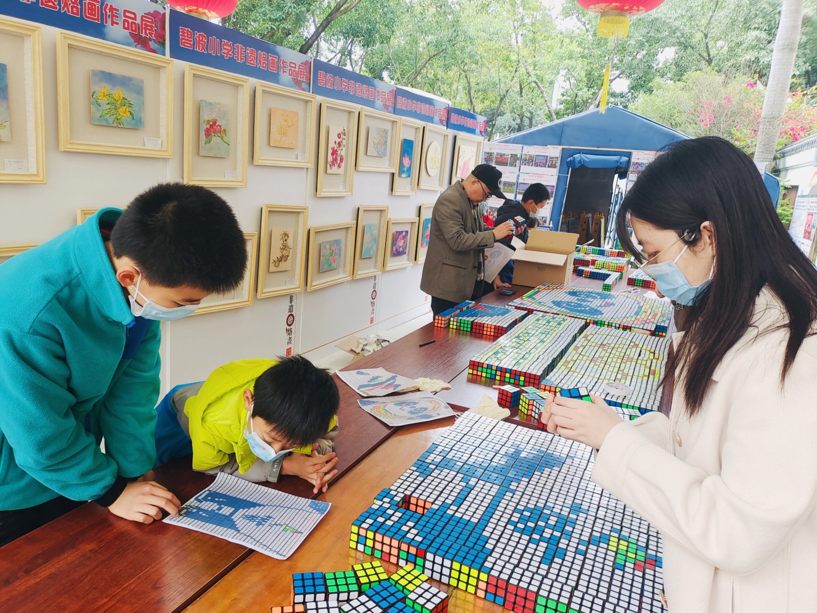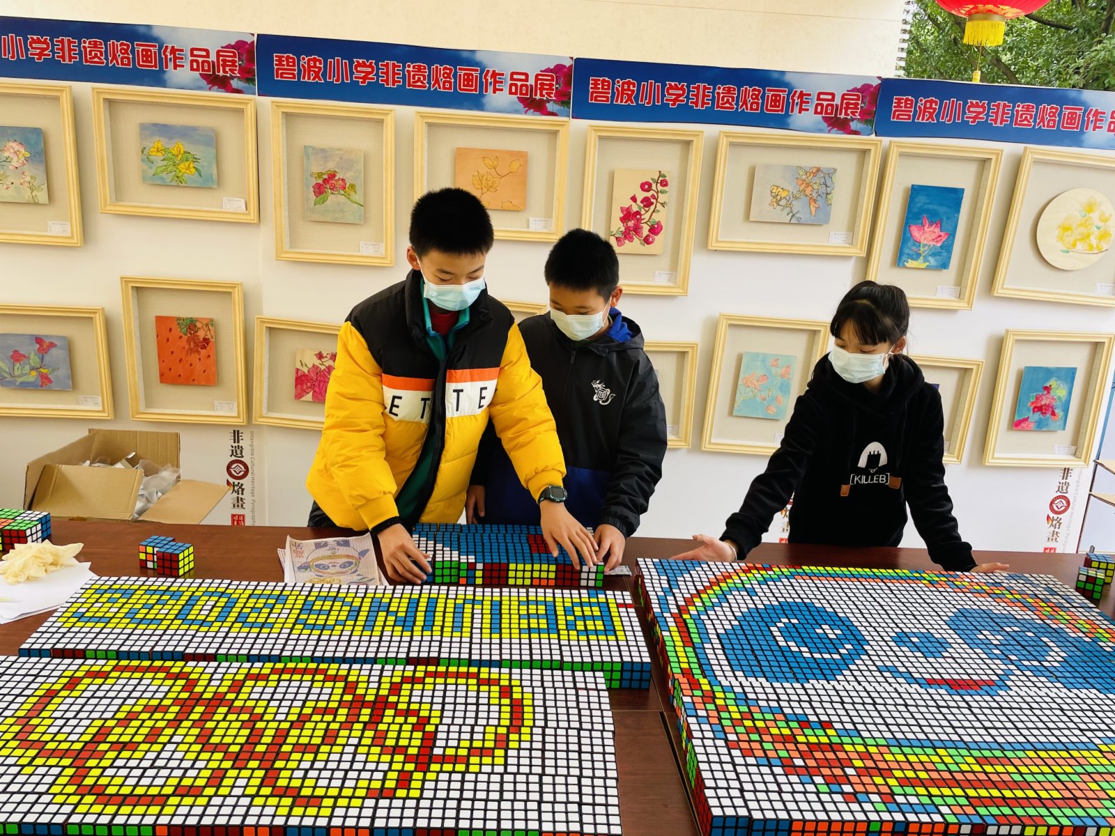 得到校長湯學儒的支持,她們立刻在網絡上四處尋找商家購買魔方,前後聯絡了四五家網店才湊齊了1200個魔方,17日一早,1200個魔方順利抵達了碧波小學校園。很快,持有核酸檢測陰性24小時報告的師生抵達校園。林炫榮、吳思婷、何佳駿、曾一凡、王軒宇五位學生在教師萬文龍和羅芷晴的帶領下,分工合作,迅速投入了拚搭中。