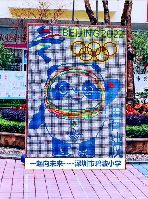 據悉,這是該校大隊輔導員王麗莎及辦公室副主任林麗真策劃設計下,五位學生在教師萬文龍和羅芷晴帶領下完成的創意作品。由於疫情,深圳中小學目前尚未開學,不過喜氣洋洋的冰墩墩圖案,點亮了寂靜的校園。