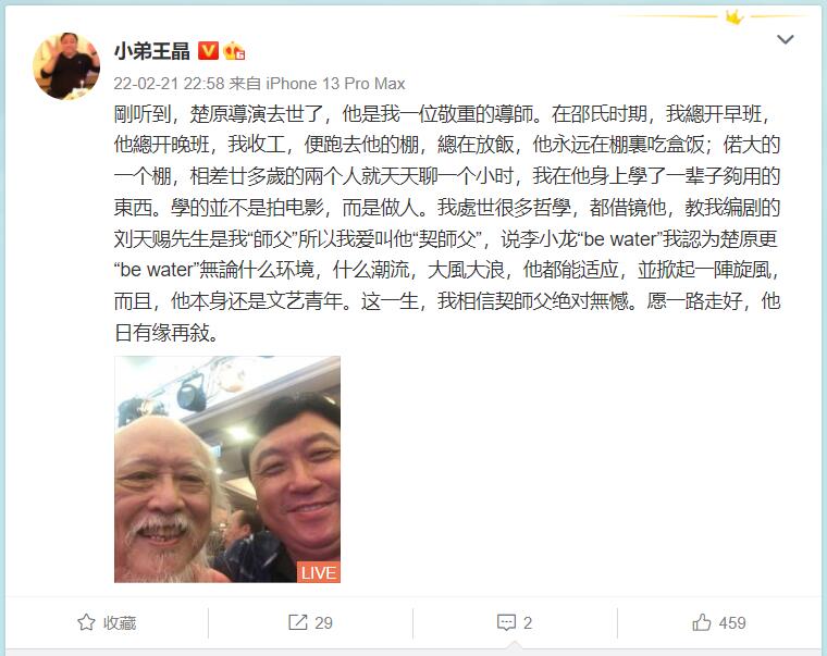 導演王晶在微博寫道:「剛聽到,楚原導演去世了,他是我一位敬重的導師。在邵氏時期,我總開早班,他總開晚班,我收工,便跑去他的棚,總在放飯,他永遠在棚裏吃盒飯;偌大的一個棚,相差廿多歲的兩個人就天天聊一個小時,我在他身上學了一輩子夠用的東西。學的並不是拍電影,而是做人。我處世很多哲學,都借鏡他,教我編劇的劉天賜先生是我『師父』所以我愛叫他『契師父』,說李小龍『be water』我認為楚原更『be water』無論什麼環境,什麼潮流,大風大浪,他都能適應,並掀起一陣旋風,而且,他本身還是文藝青年。這一生,我相信契師父絕對無憾。願一路走好,他日有緣再敍。」