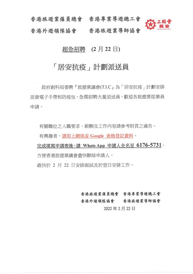 香港旅遊業僱員總會表示,旅遊業議會獲政府創科局委聘,負責為「居安抗疫」的市民派發電子手環及防疫包,因而急需招聘大量派送員,希望旅遊業從業員能共同參與抗疫工作。
