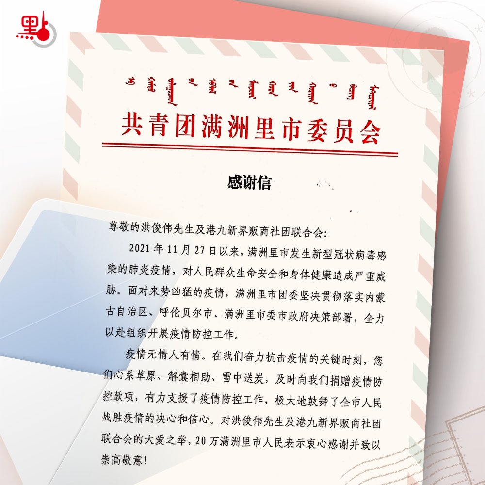 洪俊偉覺得援助滿洲里抗疫刻不容緩,立即聯繫港九新界販商社團聯合會的會員向滿洲里捐款,「我們一共30人,目標是捐10萬元人民幣,大家能湊多少湊多少,如果不夠我來包底!」大家都是小商販,拚拚湊湊出1萬元,洪俊偉自掏腰包,一個人就捐了9萬元。他將善款打到共青團滿洲里市委員會的帳號上,他們非常感動,很快就給洪俊偉寫了感謝信,信中寫道「人間有愛,因悠同在,千言萬語說不盡的感激,20 萬滿洲里市人民表示衷心感謝並致以崇高敬意!」疫情當前,香港與滿洲里兩地人民的心緊緊相連,彼此扶持,互相打氣,一起與疫情作鬥爭!