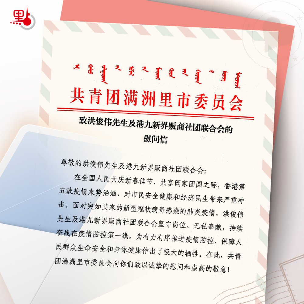 就在此時,洪俊偉收到了一封遠自祖國北方內蒙古滿洲里市寄來的慰問信,信裏寫道,「當前,香港疫情防控工作正處於關鍵時期。共青團滿洲里市委員會始終心繫着你們的安全和健康。希望洪俊偉先生在發揚愛心善意和責任擔當的同時,務必多多珍重,做好自我防護,注意勞逸結合,保持旺盛精力,再接再厲做好疫情防控工作。」