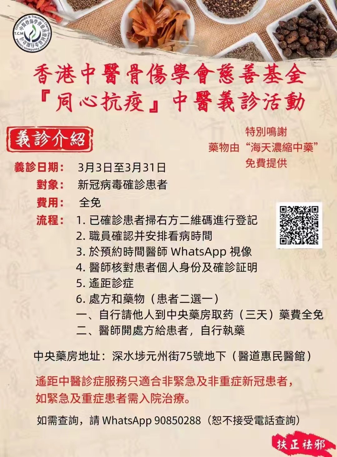 大公文匯全媒體報道:本港疫情嚴峻,衞生及醫療系統均面對嚴峻考驗,為舒緩公院壓力,香港中醫骨傷學會慈善基金「同心抗疫」中醫義診活動明日(3日)起舉辦,為新冠病毒確診患提供線上視像義診服務,並會免費送治療藥物,病人可派人到診所代領中藥。