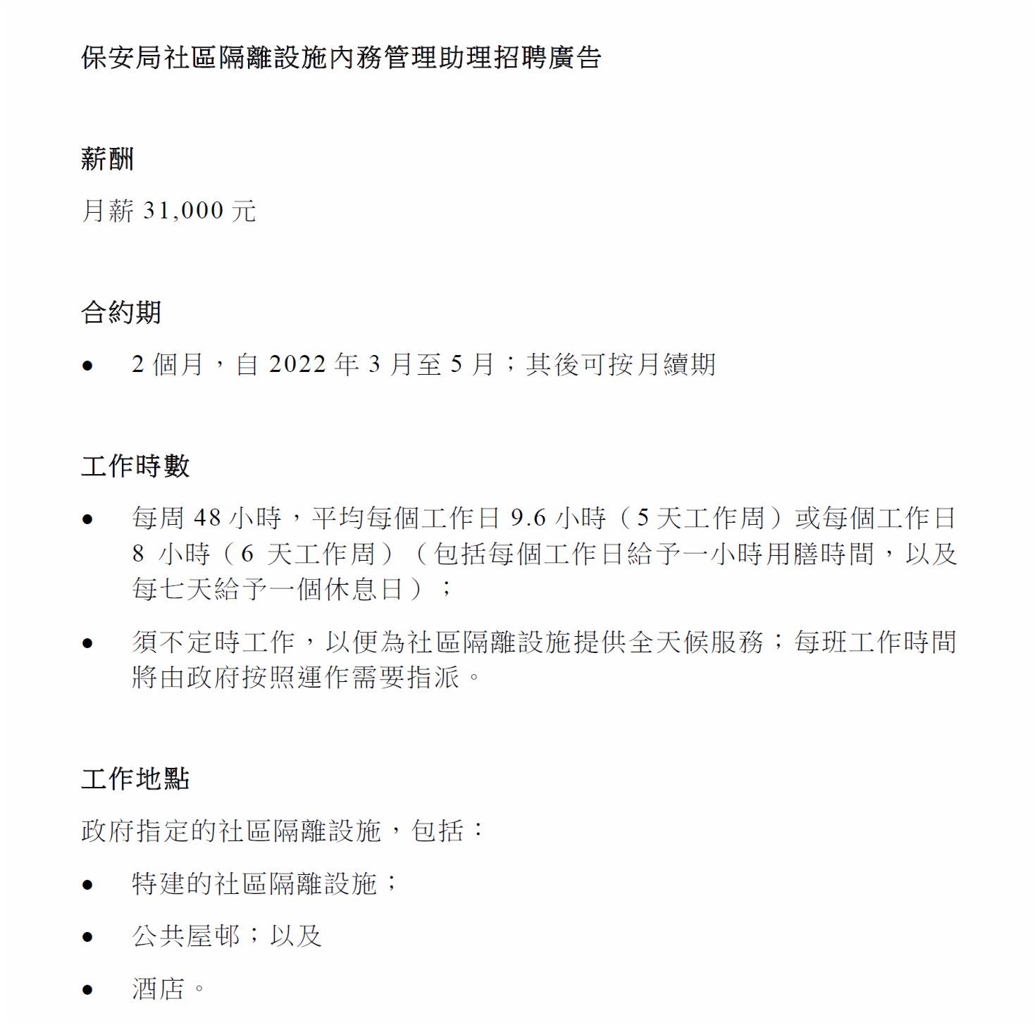 根據保安局招聘資料,社區隔離設施「內務管理助理」,每周工作時數48小時,平均每個工作日9.6小時(5天工作周)或每個工作日8小時(6天工作周),包含1小時用膳時間,每班工作時間將由政府按照運作需要指派,須不定時工作。工作地點為政府指定的社區隔離設施,包括特建的社區隔離設施、公共屋邨以及隔離酒店等等。