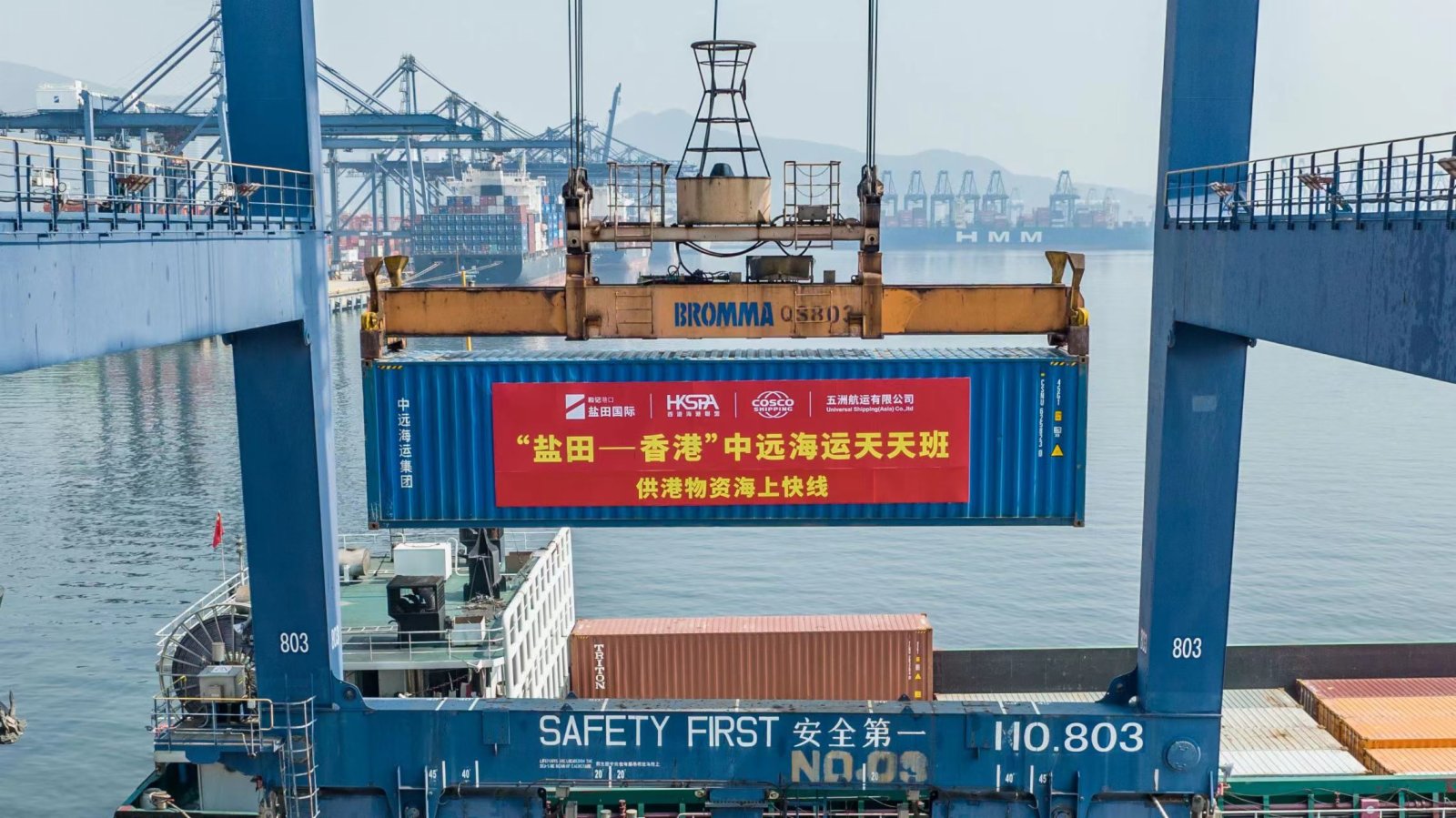 深港跨境水路運輸高效便捷、綠色環保,從招商、大鏟灣、鹽田碼頭出發的「海上供港快線」分別用2小時、5小時、8小時可直達香港碼頭。目前,招商、大鏟灣和鹽田集裝箱碼頭分別設置專用泊位、配套堆場及專用閘道,實現「海上供港快線」綠色通道,碼頭單日作業能力可達3500標箱。目前已形成「駁船專線+班輪捎帶」模式,每日開通8-10艘「海上供港快線」專線駁船,以及至少1艘班輪補充。