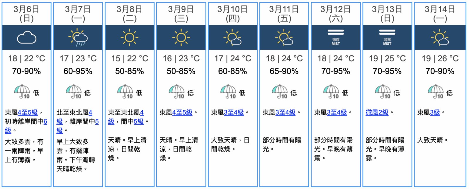 星期五、六、日部分時間有陽光。星期六、日早晚有薄霧,氣溫升至18至25度。